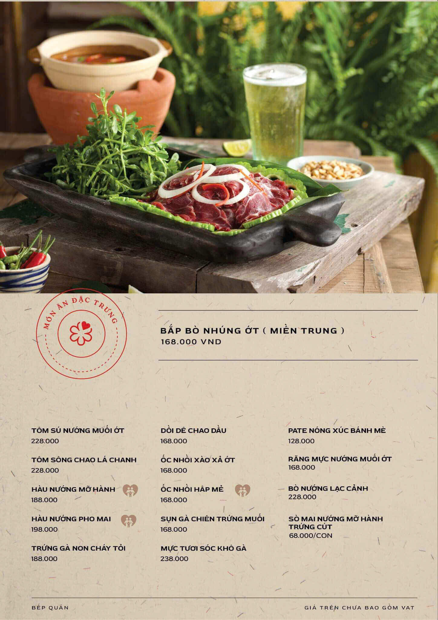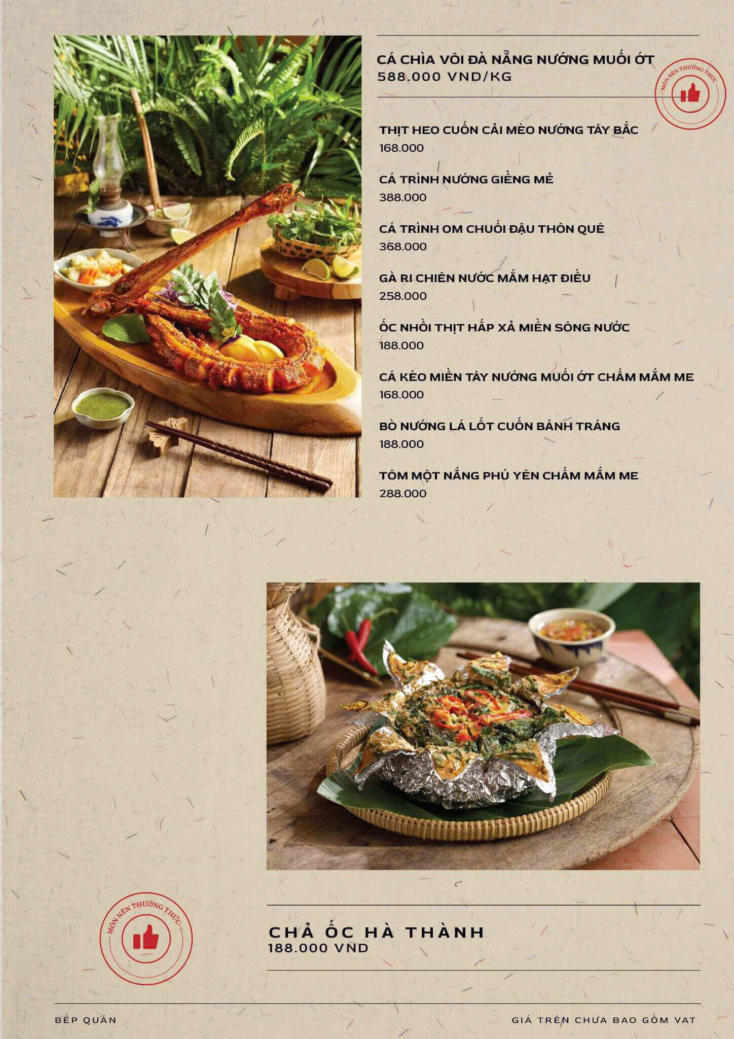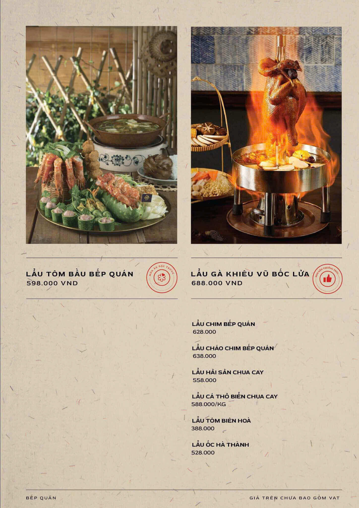 Dining at the restaurant, first-time diners will be overwhelmed by the extremely diverse menu with more than 200 delicious dishes from across the country meticulously prepared by professional chefs, each dish has its own unique character. unique characteristics of three regions' cuisine. In particular, the regular customers of Bep Quan will never forget the unique dishes such as: Millet hotpot, Gourd shrimp hotpot, Five-spice grilled pork cheek, Phan Thiet grilled squid with pangolin pepper, Chau Doc grilled beef ,... Surely when dining at Bep Quan for the first time, diners will want to come back many more times to be able to enjoy all the culinary quintessence of the three regions here.