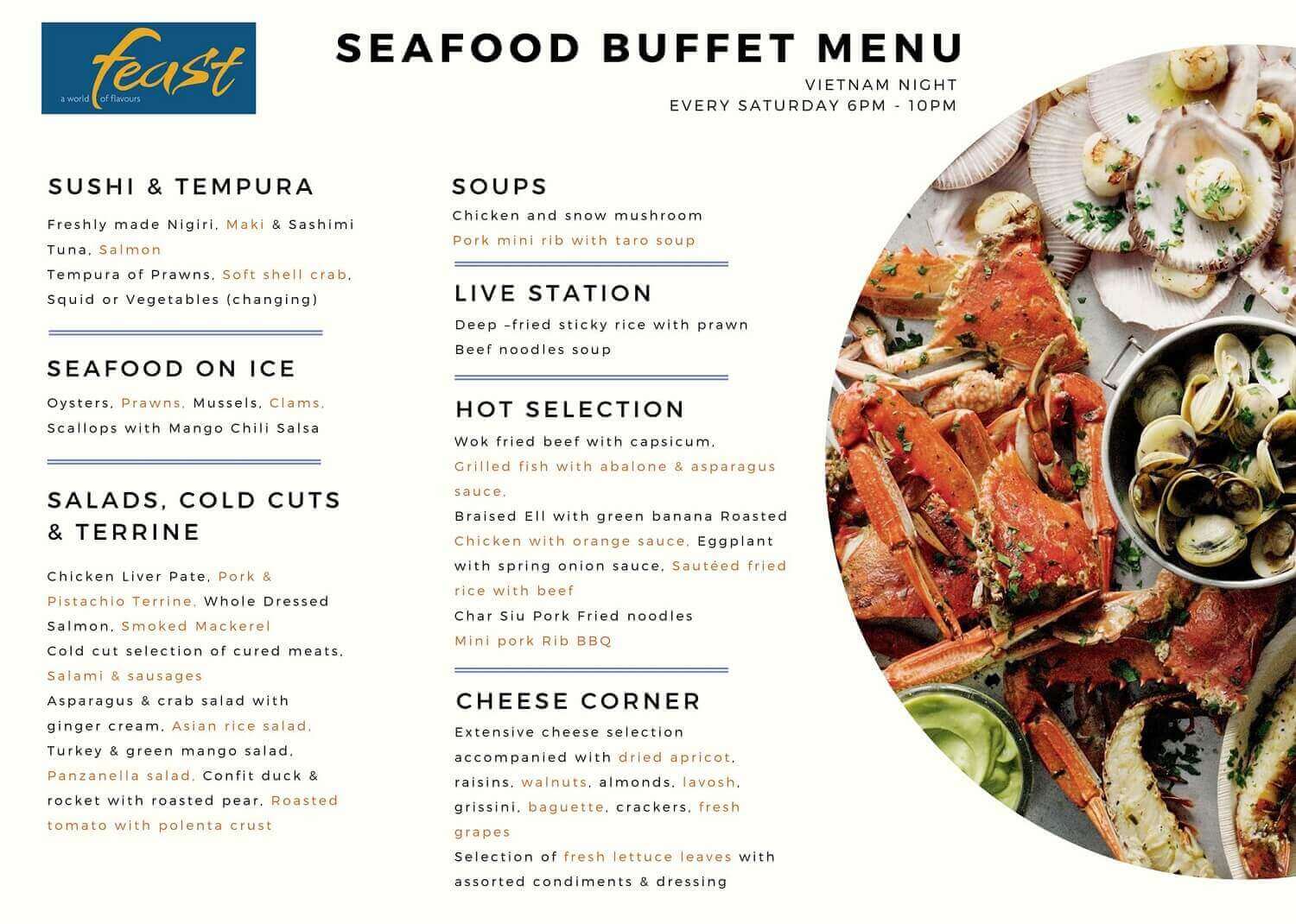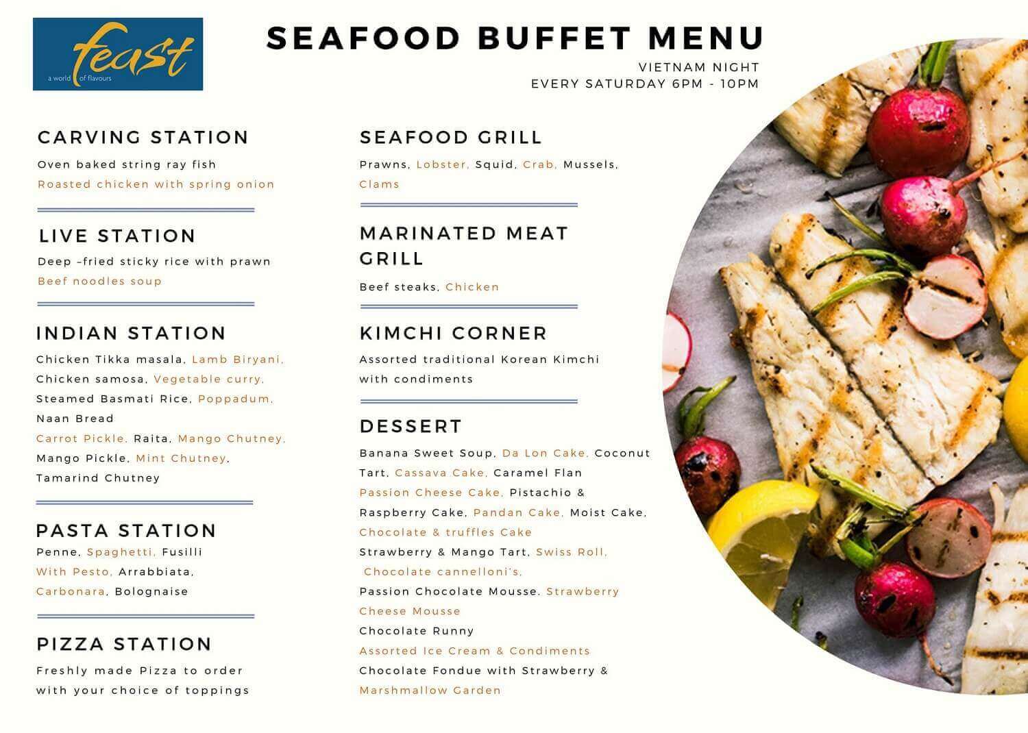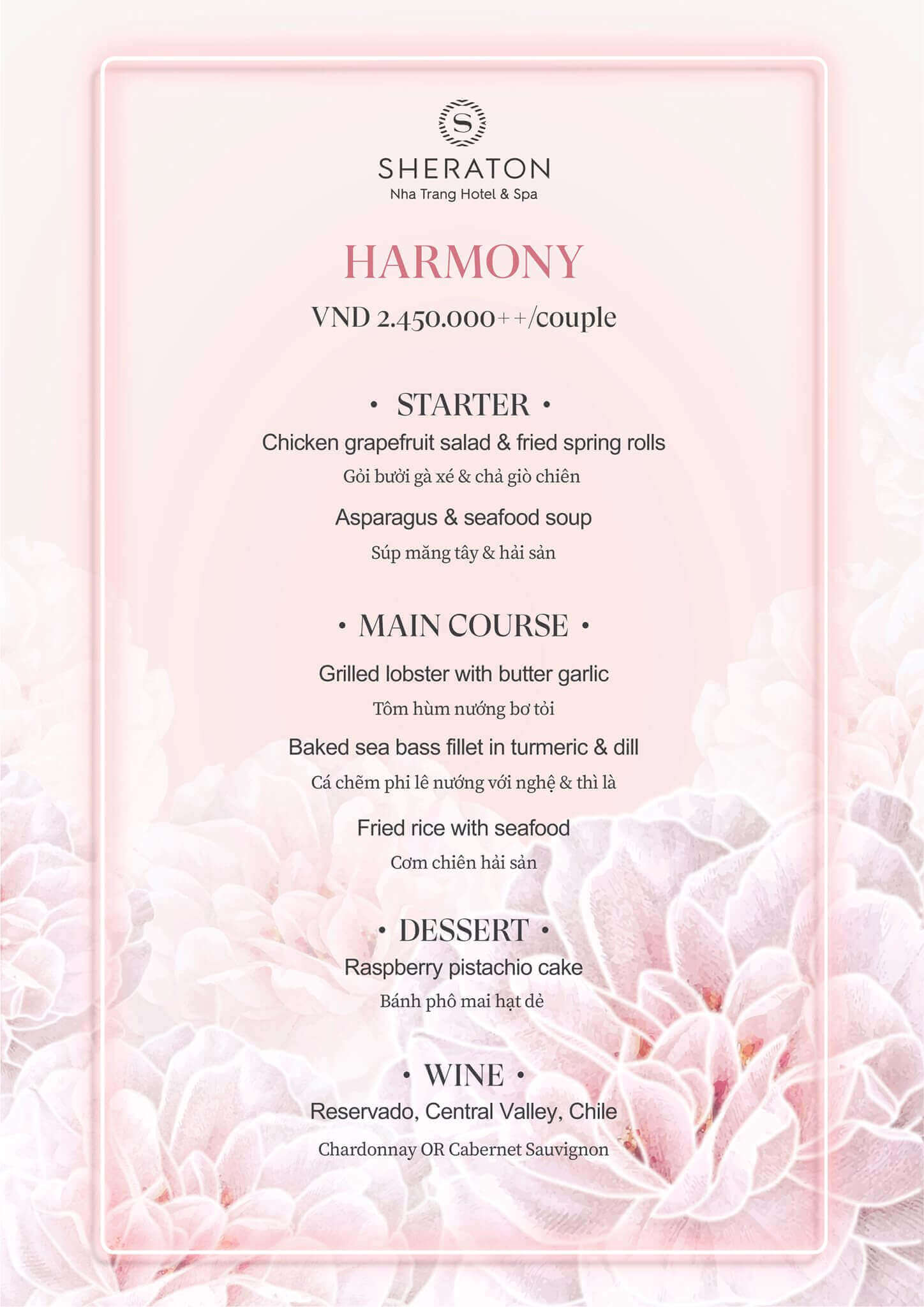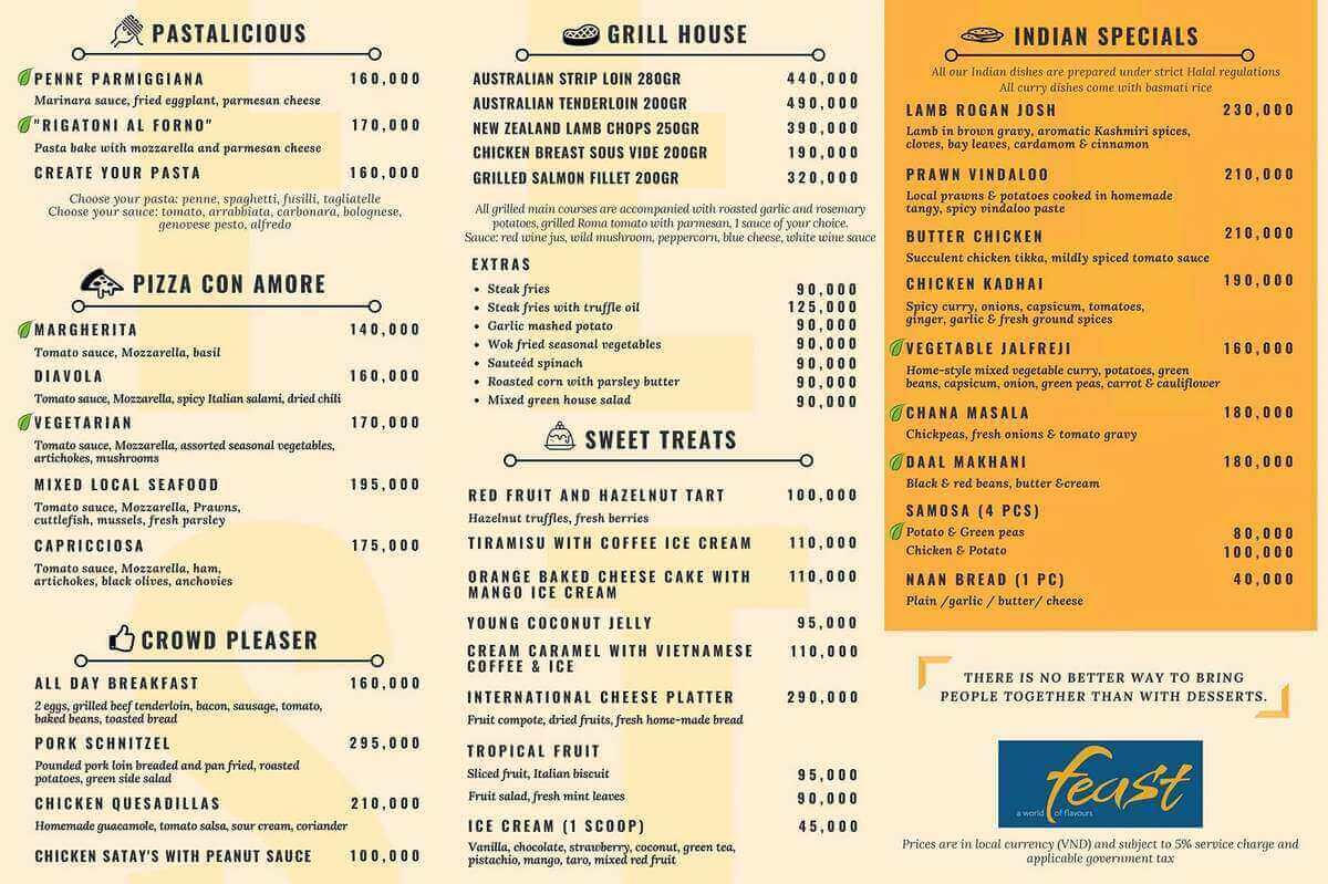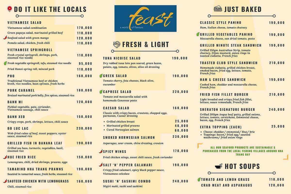 • Feast (1st floor): The main area at Dining at Sheraton Nha Trang and has a special seafood buffet or you can order International dishes on a separate menu at Feast. Open to serve 3 main meals: morning - lunch - dinner