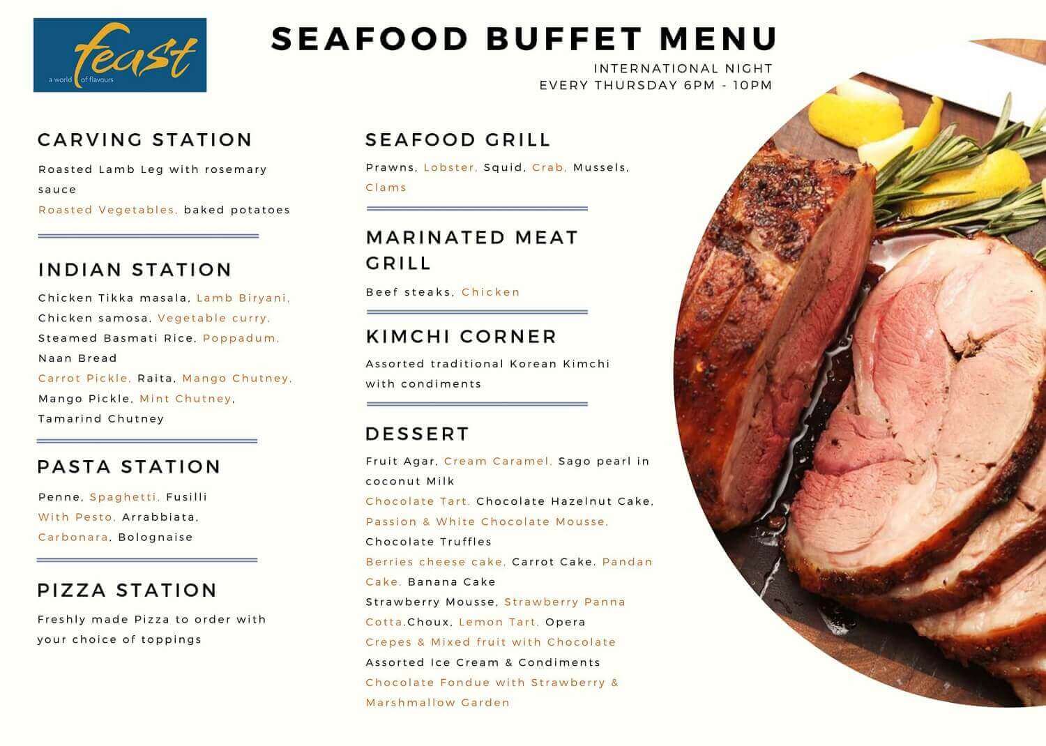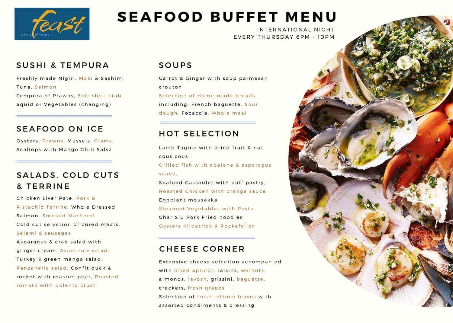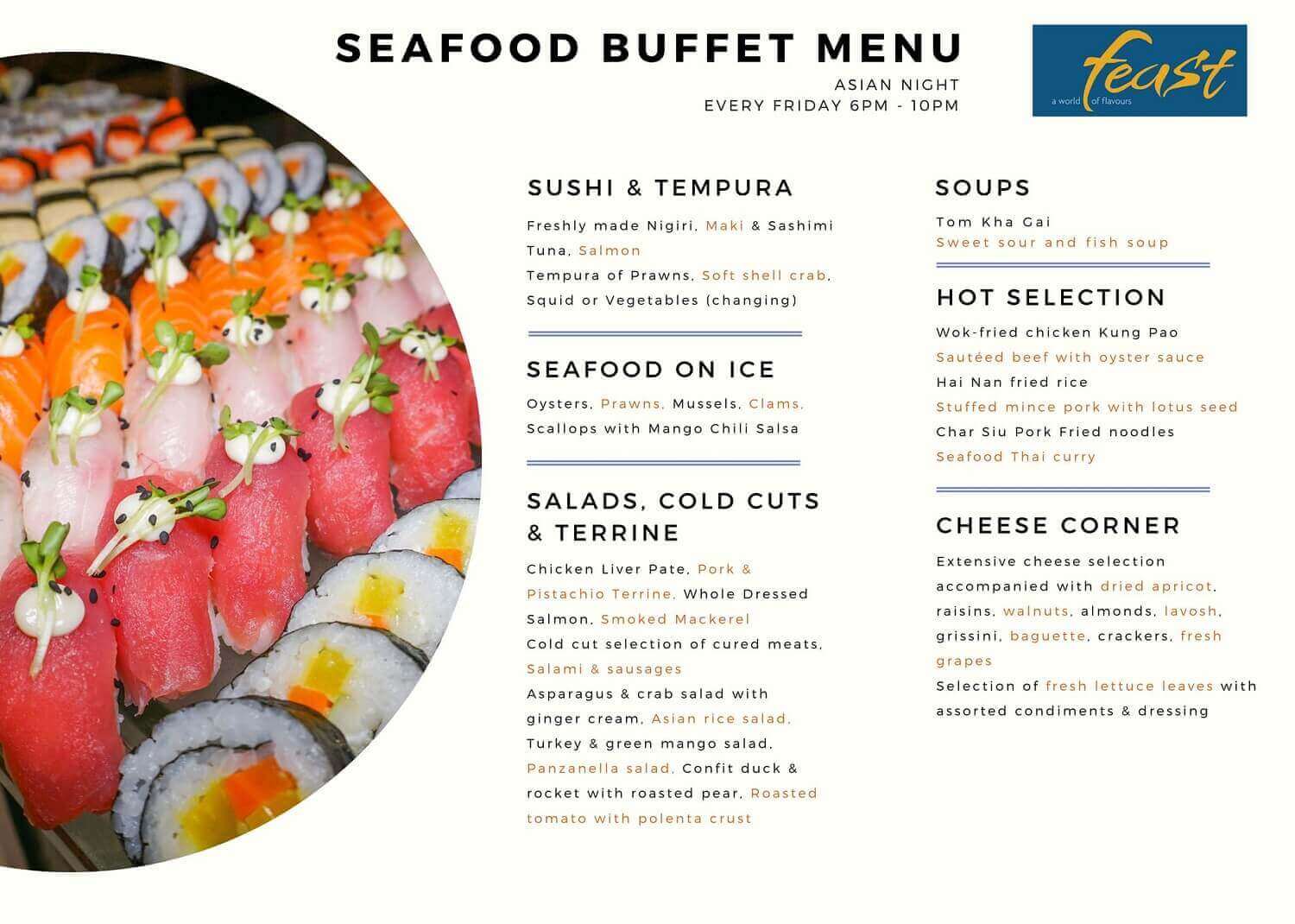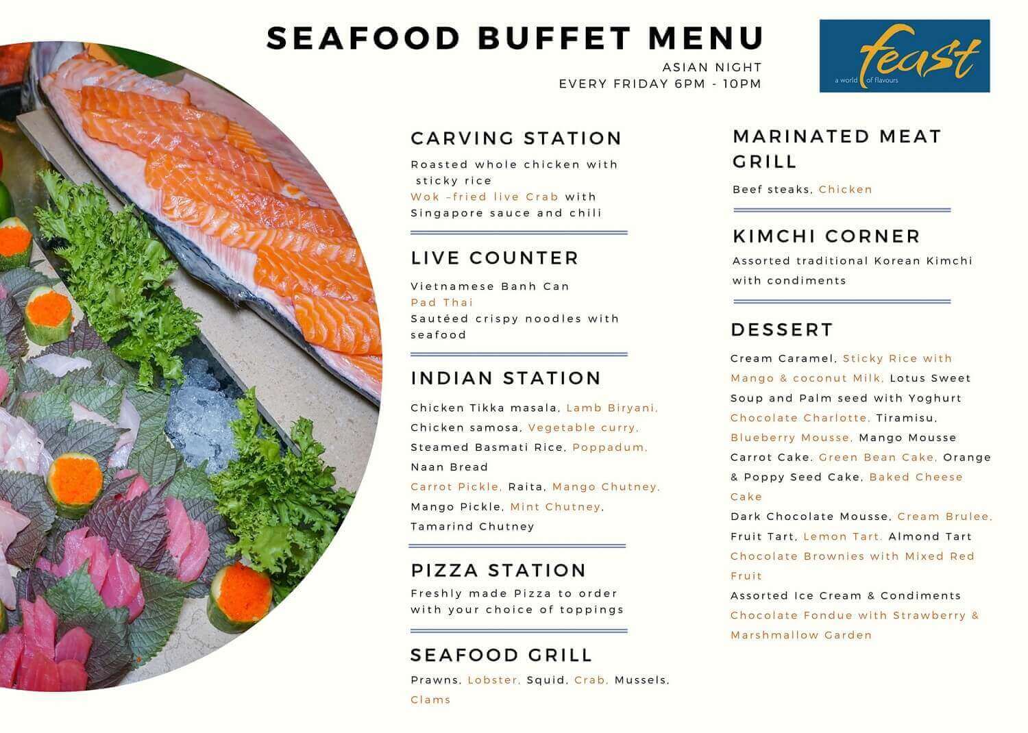 • Feast (1st floor): The main area at Dining at Sheraton Nha Trang and has a special seafood buffet or you can order International dishes on a separate menu at Feast. Open to serve 3 main meals: morning - lunch - dinner