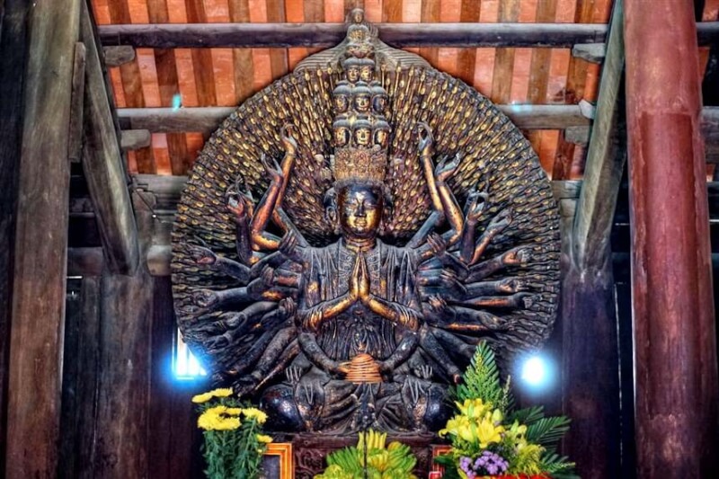これは 17 世紀のユニークな木彫の傑作で、ベトナムの国宝に指定されています。この像の高さは 3.7 メートルで、42 本の大きな腕と 952 本の小さな腕があり、それぞれの手に繊細な目があり、苦しみを救うという仏教の哲学を示しています。芸術家チュオン トーの熟練した製作技術により、この像はブトタップ パゴダの精神的な魂であるだけでなく、バクニン省の視覚芸術遺産の誇りでもあります。