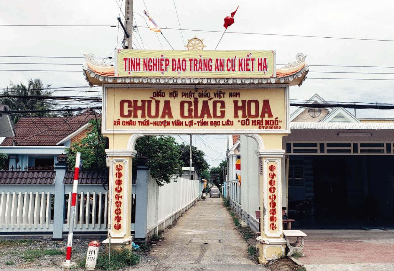 Chùa Giác Hoa hay còn gọi là chùa cô Hai Ngó tọa lạc tại ấp Xóm Lớn, xã Châu Thới, huyện Vĩnh Lợi. Chùa được xây dựng từ năm 1919 do bà Huỳnh Thị Ngó, sinh ra trong một gia đình điền chủ giàu có tiếng ở Bạc Liêu vào cuối thế kỷ 19 hiến tiền, đất để dựng nên dân gian thường gọi là Chùa Cô Hai Ngó. Tháng 10/1920 chùa hoàn thành sau 18 tháng thi công. Chùa Giác Hoa là một trong những công trình kiến trúc nghệ thuật tiêu biểu nhất ở Bạc Liêu lúc bấy giờ. Sau khi xây dựng chùa xong, cô Hai Ngó luôn tham gia và thực hiện các công việc lợi ích xã hội như dạy học, giúp đỡ người nghèo… Chùa là tổng thể các công trình kiến trúc lớn nhỏ, được bố trí chặt chẽ, cân đối theo lối “nội công, ngoại quốc”, kết hợp hài hoà kiến trúc Đông – Tây. Phía trước là Chánh điện, phía sau là sân Thiên tịnh và ngôi nhà Hậu tổ (thờ gia tiên và cô Hai Ngó, người sáng lập ra ngôi chùa). Chính điện cơ bản giống một công thự thời thuộc địa, ngự trên nền rất cao, kiên cố, màu vàng trầm mặc, mái ngói, nền gạch thẫm màu.. như một kiệt tác nghệ thuật. Các khối công trình còn lại trung thành với mảng kiến trúc chung chủ đạo Đông – Tây, đậm dấu ấn Pháp, điểm xuyến bởi chút mái cong và những dòng ký tự Đông Phương ở phía trước, nối kết các công trình và trong không gian nội bộ từng công trình là các hành lang mát mẻ, bố trí khoa học, toàn bộ không gian Giác Hoa tự nhịp nhàng cứ như một bản nhạc hài hòa. Có thể nói, riêng về không gian sinh thái, thẩm mỹ, kiến trúc và sự cổ kính, Giác Hoa tự đạt mức độ khá cao. Vào bên trong chánh điện là một không gian trang nhã, thanh tịnh, thoáng mát, được thiết kế và xây dựng hoàn toàn bằng gỗ quý. Với kết cấu 20 cột gỗ tròn có đường kính 45 cm được chạm khắc rồng, phượng và nhiều họa tiết rất tinh xảo chia làm 5 hàng ngang, chống đỡ mái ngói. Những bức tượng Phật, các vật trang trí phía trong cũng được làm bằng gỗ tốt. Trong khuôn viên ngôi chùa còn có những công trình kiến trúc độc đáo như tượng bán thân Phật Quan Âm trên núi, thầy trò Đường Tam Tạng đi thỉnh kinh, thác nước, tượng 12 con giáp, … tạo thêm nét đặc sắc cho ngôi chùa. Đặc biệt trong hai cuộc kháng chiến Chùa Giác Hoa là cơ sở cách mạng, nuôi chứa nhiều chiến sĩ, cán bộ. Năm 1945 hưởng ứng lời kêu gọi “Hũ gạo nuôi quân” của Hồ Chủ Tịch, cô Hai Ngó đã ủng hộ cho cách mạng 2.000 giạ lúa. Với những giá trị đó, chùa đã được Ủy ban nhân dân tỉnh Bạc Liêu công nhận là di tích lịch sử văn hóa cấp tỉnh năm 2001. Ngôi chùa còn là nơi truyền dạy Phật học, mở lớp “an cư kiết hạ” đầu tiên cho hàng trăm tăng ni đến học miễn phí. Hiện nay, ngôi chùa còn có Trường trung cấp Phật học của Giáo hội Phật giáo tỉnh Bạc Liêu quản lý, cái nôi của giáo dục ni giới Nam Bộ. Chùa Giác Hoa ngày nay đẹp uy nghi, lộng lẫy, trở thành điểm du lịch tâm linh Bạc Liêu nổi tiếng đón tiếp hàng trăm ngàn khách thập phương mỗi năm. Nguồn: Du lịch Bạc Liêu