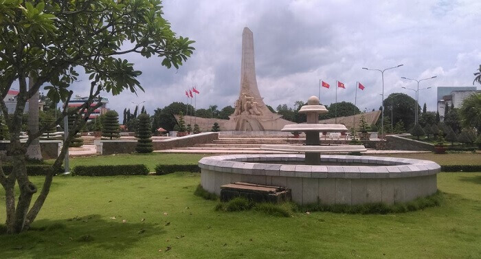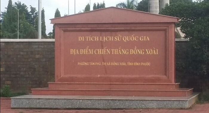 Di tích Địa điểm Chiến thắng Đồng Xoài tọa lạc tại phường Tân Phú, thành phố Đồng Xoài, tỉnh Bình Phước. Đầu năm 1965, sau chiến thắng Bình Giã và sự sụp đổ của chiến lược “chiến tranh đặc biệt” của Mỹ, phong trào đấu tranh của nhân dân ta ở miền Nam đã có bước phát triển mới. Quân ủy và Bộ Chỉ huy Miền quyết định mở Chiến dịch Phước Long – Đồng Xoài, Đồng Xoài được chọn là chiến trường trọng điểm của chiến dịch. Để chuẩn bị cho chiến dịch, công tác hậu cần được chuẩn bị chu đáo. Nhân dân tích cực đóng góp sức người, sức của, tập trung đảm bảo dân công, lương thực, thực phẩm…Có thể nói, những ngày chuẩn bị cho Chiến dịch Đồng Xoài, cả rừng núi Phước Long ngày đêm không ngủ. Tiếng chày giã gạo, ánh đuốc lồ ô, tiếng bước chân, tiếng nói, tiếng cười dân công…tất cả đã tạo nên bức tranh hoàn thiện về toàn dân làm hậu cần, toàn dân kháng chiến của đồng bào các dân tộc vùng rừng núi miền Đông Nam Bộ. Trực tiếp tham gia trận đánh tại hướng chiến lược Đồng Xoài là các Trung đoàn 1 (Q761), Trung đoàn 2 (Q762), Trung đoàn 3 (Q763) thuộc Sư đoàn 9 chủ lực… Nhiều chiến sĩ viết khẩu hiệu lên nón, lên báng súng nội dung: “Quyết tử giải phóng Đồng Xoài”, “Bị thương nặng không kêu la, bị thương nhẹ không rời trận địa” hoặc “Quyết tâm dứt điểm Đồng Xoài, không dứt điểm Đồng Xoài không về”. Trận đánh chi khu Đồng Xoài diễn ra trong 3 ngày, bắt đầu từ ngày 09/6/1965 đến ngày 12/6/1965, ta hoàn thành nhiệm vụ đánh, tiêu diệt chi khu Đồng Xoài. Chiến thắng Đồng Xoài cùng với chiến thắng Bình Giã, Ba Gia đã góp phần làm thất bại hoàn toàn chiến lược “Chiến tranh đặc biệt” của đế quốc Mỹ và đã “thêm một trang vẻ vang vào lịch sử đấu tranh của Mặt trận Dân tộc Giải phóng miền Nam Việt Nam chống cuộc chiến tranh của Đế quốc Mỹ xâm lược”. Di tích Địa điểm Chiến thắng Đồng Xoài được xây dựng năm 2005 với tổng diện tích 16.932,88m2, gồm các hạng mục công trình: Tượng đài chiến thắng, tranh phù điêu, nhà trưng bày lưu niệm, hệ thống cây xanh, đài phun nước…Một phần lịch sử hào hùng của Chiến dịch Phước Long – Đồng Xoài đã được tái hiện ở tượng đài với hình tượng 3 chiến sĩ trong tư thế hiệp đồng tác chiến, xông lên chiến đấu đã lột tả được tinh thần đấu tranh quả cảm. Phía sau tượng đài, 2 bức phù điêu minh họa khí thế của trận đánh Đồng Xoài rực lửa năm xưa bằng việc tái hiện sinh động toàn cảnh quá trình công tác chuẩn bị mọi mặt và diễn biến tấn công, thời khắc chiến thắng của quân và dân ta. Với những giá trị lịch sử to lớn, di tích Địa điểm Chiến thắng Đồng Xoài được Bộ trưởng Bộ Văn hóa, Thể thao và Du lịch quyết định xếp hạng di tích lịch sử quốc gia ngày 12/12/2014. Nguồn: Trang Thông Tin Điện Tử Bảo Tàng Tỉnh Bình Phước