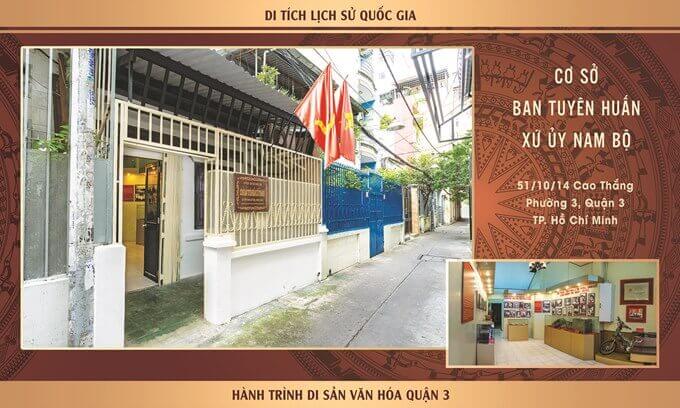 Sau khi Hiệp định Genève 1954 được ký kết, Xứ ủy Nam Bộ đã sử dụng căn nhà số 51/10/14 đường Cao Thắng để làm cơ sở của Ban Tuyên huấn Xứ ủy Nam Bộ và một số đơn vị Khu Sài Gòn - Gia Định trong thời kỳ kháng chiến chống Mỹ. Căn nhà có nền gạch, mái lợp ngói- nhà chính rộng 3,6m, dài 15m và nhà bếp rộng 3,6m, dài 6m. Tại đây, Ban Tuyên huấn Xứ ủy Nam Bộ đặt máy thu thanh và giao cho đồng chí Đỗ Văn Ba (tức Đỗ Văn Hạng), cán bộ Xứ ủy phụ trách cơ sở, thu tin từ Đài Phát thanh Hà Nội và biên tập thành tài liệu, in ấn, phát hành cho các cơ sở của Xứ ủy nắm tin tức và thực hiện chỉ thị của Trung ương đối với Nam Bộ. Ngoài ra, Ban Tuyên huấn Xứ ủy đã tổ chức nhiều cuộc họp quan trọng có các đồng chí cán bộ lãnh đạo cao cấp của thành phố tham dự như đồng chí Trần Bạch Đằng, Phạm Dân, Tân Đức, Đỗ Văn Ba… cho đến khi Ban Tuyên huấn Xứ ủy chuyển về Chiến khu D năm 1957. Từ năm 1957 đến năm 1961, cơ sở Ban Cán sự thị xã Mỹ Tho và Ban Chấp hành phụ nữ giải phóng thị xã Mỹ Tho tiếp tục sử dụng ngôi nhà này để làm điểm tạm trú đồng thời là nơi móc nối liên lạc, hội họp chỉ đạo phong trào đấu tranh của tỉnh Mỹ Tho. Năm 1964, bà Trần Thị Ngọc Sương đã vận động được gia đình ông Tư Bôn ở nhà sát bên để mở rộng cơ sở cho Ban Trí vận Khu ủy sử dụng: nơi đây Anh hùng Lực lượng vũ trang Lê Thị Riêng (Cô Chín), Trưởng Ban Phụ vận Khu ủy cùng các đồng chí Nguyễn Thị Ngoan (Bí thư Ban Phụ vận nội thành), Nguyễn Thị Chơn, Trần Thị Lan, Ngô Bá Thành… đã từng sống và làm việc. Dưới sự chỉ đạo của đồng chí Lê Thị Riêng, cơ sở Ban Trí vận Khu ủy đã viết, in và phát hành một số tờ báo như: “Phụ nữ”, “Sài Gòn vùng lên”, “Trung lập” và tổ chức đưa một số phụ nữ vào hoạt động trong các phong trào: “Hội bảo vệ nhân phẩm và quyền lợi phụ nữ”, “Phụ nữ đòi quyền sống”, “Đòi cải thiện chế độ lao tù”…Đặc biệt, trong Cuộc Tổng tiến công và nổi dậy Xuân Mậu Thân 1968, lực lượng Vũ trang Ban Phụ vận cũng đã sử dụng nơi đây để cất dấu vũ khí chuẩn bị cho chiến dịch. Đồng chí Đoàn Lê Phong, Đỗ Ngọc Trinh (Bảy Hà), cán bộ Thành Đoàn sử dụng làm điểm tập kết lực lượng đi phá kềm ở Chợ Bàn Cờ, tổ chức may cờ đi treo và viết truyền đơn rải ở chợ kêu gọi đồng bào đấu tranh chống địch. Năm 1969, tại ngôi nhà này bà Trần Thị Ngọc Sương đã lưu trữ nhiều báo chí, tài liệu để chuyển đến cho phái đoàn Việt Nam tham dự Hội nghị Paris để nắm tin tức đấu tranh tại Hội nghị. Ngày cuối cùng của cuộc kháng chiến chống đế quốc Mỹ (30 tháng 4 năm 1975), Đoàn cán bộ tiếp quản thành phố của Thành ủy do đồng chí Phạm Khải (Ba Ka) dẫn đầu xuất phát từ ngôi nhà này đi tiếp quản Bưu điện và Tòa Đô chính Sài Gòn. Với những giá trị lịch sử đó , Cơ sở Ban Tuyên huấn xứ ủy Nam Bộ được Bộ Văn hóa xếp hạng là di tích lịch sử quốc gia theo Quyết định số 1288-Văn Hóa /Quyết Định ngày 16 tháng 11 năm 1998. Nguồn Trang thông tin điện tử quận 3, thành phố Hồ Chí Minh
