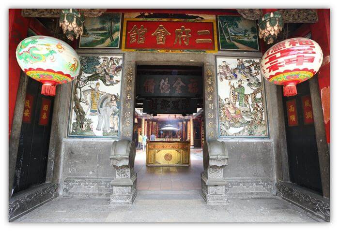 Miếu Nhị Phủ, Nhị Phủ hội quán hay còn được gọi là chùa ông Bổn, tọa lạc tại 264 đường Hải Thượng Lãn Ông, phường 14, quận 5, thành phố Hồ Chí Minh. Có tên là Nhị Phủ vì miếu được thành lập do sự đóng góp của người Hoa gốc ở hai phủ Tuyền Châu và Chương Châu, Phúc Kiến, Trung Quốc. Về sau nhóm Tuyền Châu lập hội quán Ôn Lăng, nhóm Chương Châu lập hội quán Chương Châu (nay là Hà Chương). Không rõ miếu được xây dựng năm nào. Hiện nay trong miếu còn lưu giữ một chuông cổ. Trên chuông chỉ đúc hàng chữ "Nhị phủ Đại Bá Công Ất Dậu trong thu cát đán..." nên khó xác định niên đại. Trong "Cổ Gia Định phong cảnh vịnh", bài phú mô tả phong cảnh Gia Định từ năm 1770 đến năm 1815. Trên một câu đối treo ở chính điện hội quán Hà Chương (được thành lập sau miếu Nhị Phủ) có ghi năm trùng tu là Gia Khánh Kỷ Tỵ tức năm 1809. Như vậy hội quán này được xây dựng muộn nhất là vào cuối thế kỷ XVIII. Từ những dữ liệu trên, có thể nói "Ất Dậu"chạm trên chuông là năm 1765, cũng là năm thành lập miếu. Từ khi thành lập đến nay, miếu đã qua ba lần trùng tu lớn vào những năm 1875, 1901 và 1990. Dù vậy, miếu vẫn giữ được nét cổ kính qua phong cách kiến trúc và trang trí truyền thống của người Hoa - Phúc Kiến. Khuôn viên miếu rộng khoảng hai ngàn năm trăm mét vuông. Phần sân chiếm gần phân nửa diện tích. Không gian còn lại bao gồm các điện thờ, trụ sở hội quán và sân thiên tỉnh. Miếu có dạng nhà khung gỗ, mái ngói, tường gạch. Vách mặt tiền ghép bằng các phiến đá. Bộ khung gỗ được sơn màu đỏ, trang trí đẹp mắt bằng các bông sen chạm ngược ở đầu các thanh chống xà gồ dưới mái hiên, các tượng kỳ lân bằng gỗ đầu xà cột hay những diềm gỗ chạm lộng trên thanh ngang...Mái miếu lợp ngói ống, diềm mái là hàng ngói thanh lưu ly. Hình thức vì kèo "chồng rường - giá chiêng" khiến mái miếu hơi cong cộng với thiết kế tạo hình hai tầng mái và các đầu đỉnh mái, đầu đao uốn cong tạo cho ngôi miếu có dáng một chiếc thuyền rồng... Trên mái trang trí tượng cá hóa long, mai, lan, cúc, trúc, rồng, phượng... bằng gốm sứ nhiều màu sắc. Ơở gờ đỉnh mái có tượng lưỡng long tranh châu. Thân rồng không duỗi dài như thường thấy mà gần như dựng thẳng, đuôi xòe cao. Bên trong miếu bài trí đơn giản nhưng không kém phần trang nghiêm. Trên mỗi cột gỗ cao sơn màu đỏ, được kê bằng các chân đá chạm trổ mỹ thuật, có treo một hoặc hai câu đối. Nhiều câu đối cao hơn 3 mét, được làm cong theo chiều cong của cột. Hoành phi cũng được trang trí nhiều nơi. Có tất cả 14 câu đối và 30 hoành phi, phần lớn được làm từ năm 1864 đến năm 1901. Các hoành phi, câu đối được chạm viền chung quanh, bên trong chạm nổi các chữ Hán trên nền hoa văn rồng mây, sóng nước... ngoài ý nghĩa ca ngợi thần thánh còn có giá trị nghệ thuật thư pháp và nghệ thuật chạm gỗ. Bàn thờ ông Bổn tức Phúc Đức chính thần, vị thần bảo hộ đất đai theo tín ngưỡng của người Hoa đặt giữa chính điện. Hai bên thờ Quảng Trạch tôn vương và Thái Tuế gia gia. Dọc hai bên thiên tỉnh trước chính điện là hai gian thờ Quan Thánh đế quân và Chúa Sinh nương nương. Hậu điện thờ Ngọc Hoàng đại đế, Thích ca Phật tổ và Quan Âm Bồ tát. Các vị thần, thánh được thể hiện bằng tượng gỗ hay thạch cao đặt trang trọng trong các khám thờ. Nổi bật nhất là khám thờ ông Bổn được làm năm 1894. Khám thờ bằng gỗ, sơn nhũ vàng, chạm trổ các đề tài lưỡng long tranh châu, ngô đồng - phượng, lân hàm châu... xen kẻ hoa văn đồng tiền, chữ thọ, các con vật miền sông nước như tôm, cua, cá... là một tác phẩm của nghệ thuật chạm khắc gỗ, một hiện vật quý của miếu. Ngoài ra còn có những hiện vật giá trị khác như chuông cổ bằng hợp kim đúc năm Ất Dậu (1765), chuông bằng gang làm năm 1875, tượng kỳ lân bằng đá, các bao lam, bình phông, hoành phi, câu đối... có niên đại cuối thế kỷ 19. Miếu Nhị Phủ được xem là một trong những đền miếu xưa nhất của người Hoa ở thành phố Hồ Chí Minh. Là một công trình kiến trúc đặc sắc với nghệ thuật chạm đá, chạm gỗ tinh xảo, miếu Nhị Phủ không chỉ thể hiện sự giao lưu văn hóa Hoa - Việt mà còn đánh dấu sự định cư và phát triển của người Hoa Phúc Kiến, gắn liền với sự phát triển của Sài Gòn xưa. Ngày 31/8/1998 miếu Nhị Phủ đã được Bộ Văn hóa Thông tin công nhận là di tích kiến trúc nghệ thuật theo quyết định số 1811/1998/Quyết Định-Bộ Văn Hóa Thông Tin. Nguồn Cổng thông tin điện tử quận 5, thành phố Hồ Chí Minh.