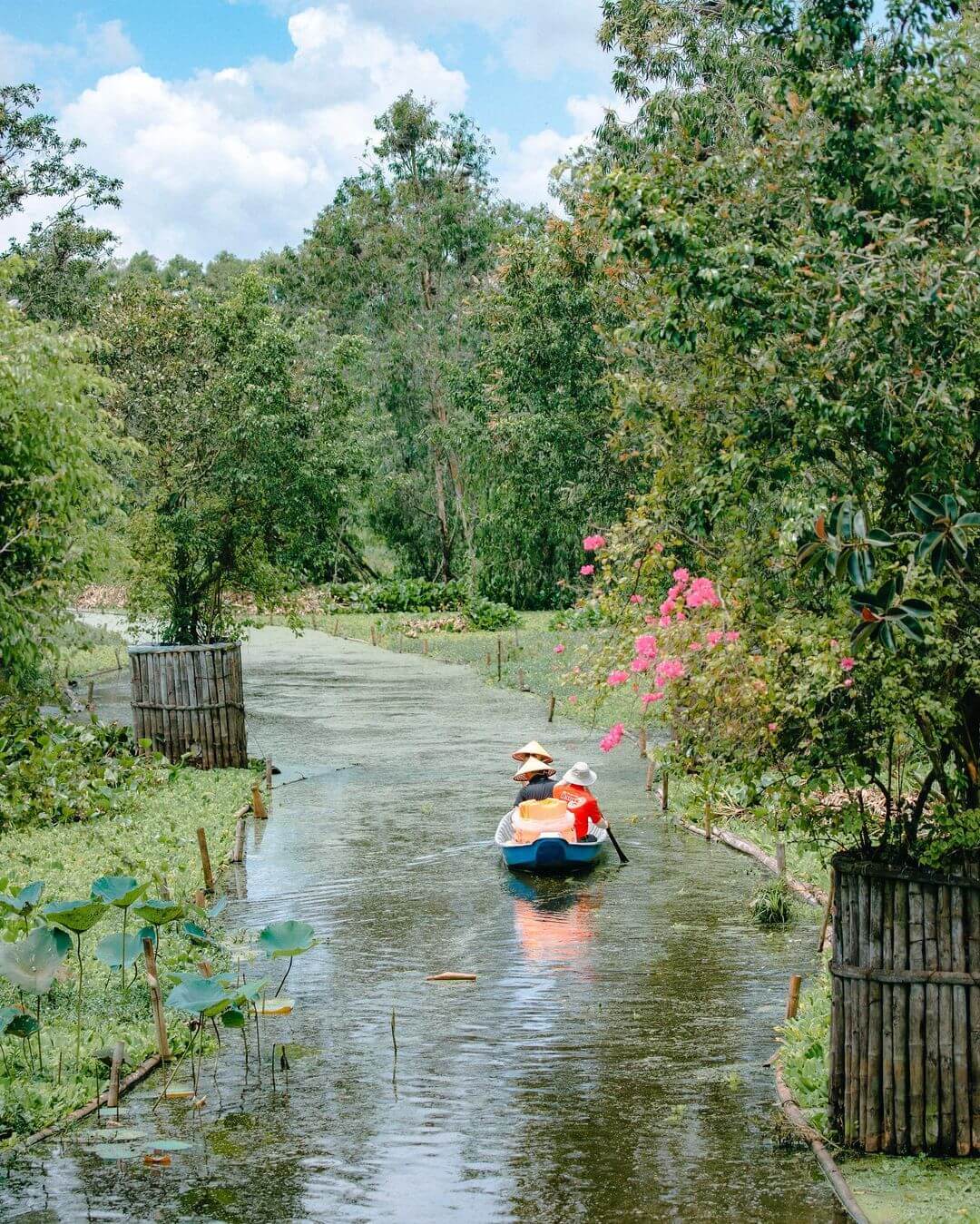 Khi đến vùng lõi,mình chuyển sang chiếc xuồng chèo tay để đi sâu vào rừng. Không có tiếng động cơ hay âm thanh ồn ào,những chiếc xuồng nhỏ cho 4 người nhẹ nhàng trôi theo dòng nước,len lỏi vào những con rạch nhỏ và đi qua những tán tràm xanh mát. Lúc này,bạn có thể thấy những lớp bèo trôi lênh đênh trên mặt nước. Hoa điên điển vàng rực kết hợp với rừng tràm xanh mướt tạo nên bức tranh thiên nhiên tuyệt đẹp.