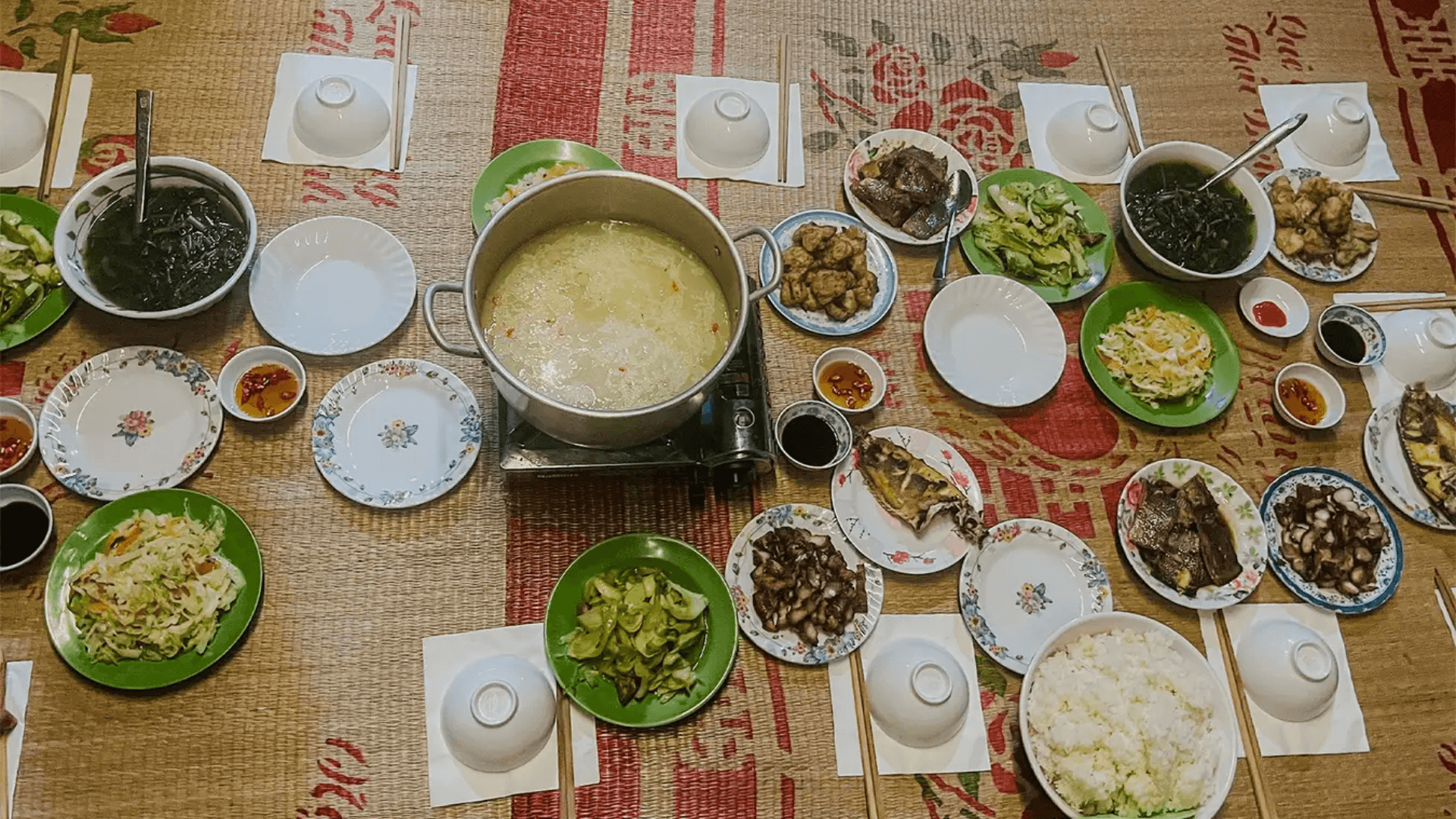Bữa cơm thường chỉ gồm vài món ăn đơn giản như thịt ba chỉ nướng,trứng kho,cá chiên và đậu hũ sốt,nhưng lại mang đến hương vị thơm ngon đến bất ngờ. Mọi người cùng quây quần trên một tấm chiếu nhỏ bên trong chòi kiểm lâm,vừa ăn vừa trò chuyện,thỉnh thoảng vang lên những tiếng cười rộn rã từ những câu đùa dí dỏm của các anh kiểm lâm.