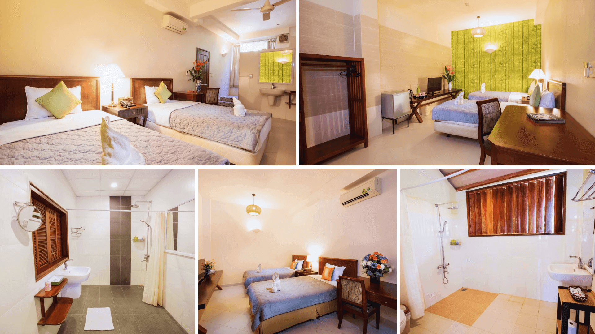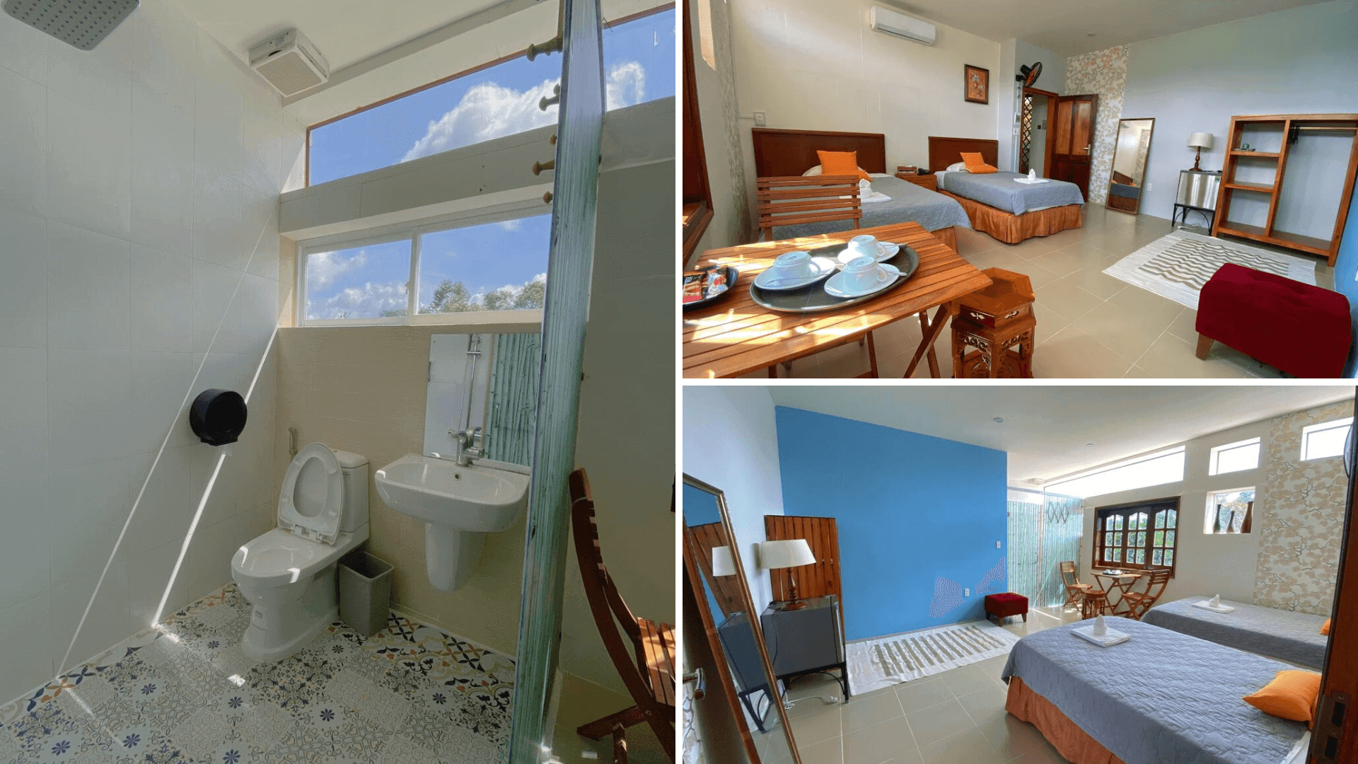 Mỗi phòng có diện tích khoảng 42m2 gồm có 2 giường đơn tiện nghi,mang đến không gian thoải mái và dễ chịu. Cửa sổ mở ra khu vườn xanh mát,mang lại cảm giác thư thái. Nội thất trong phòng được trang trí nhẹ nhàng với hình ảnh cây tre xanh,tạo nên một không gian giản dị và yên bình. Từ đó góp phần mang đến một cảm giác thư giãn,như thể bạn đang lạc vào một khu vườn nhỏ giữa lòng thiên nhiên.