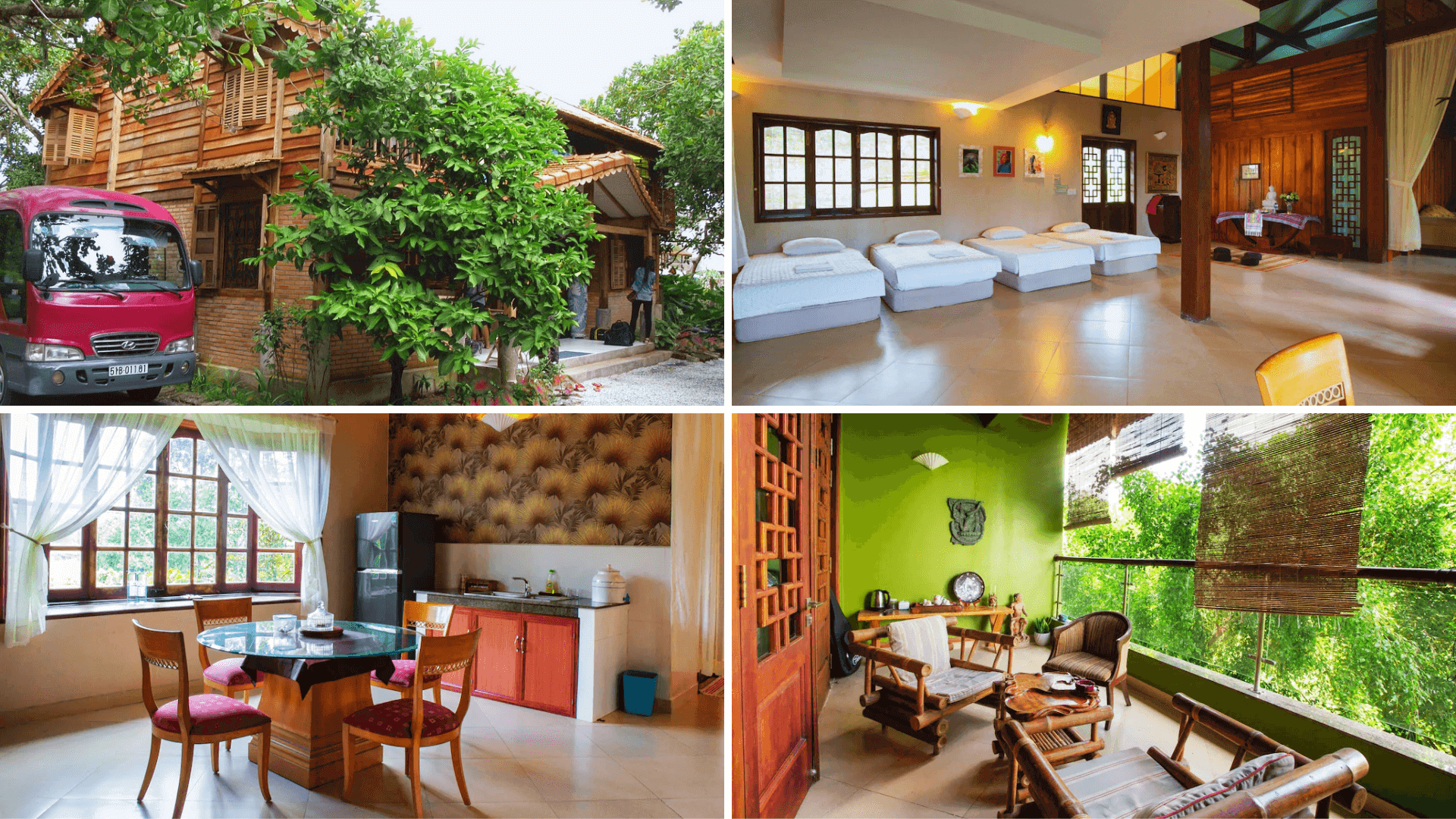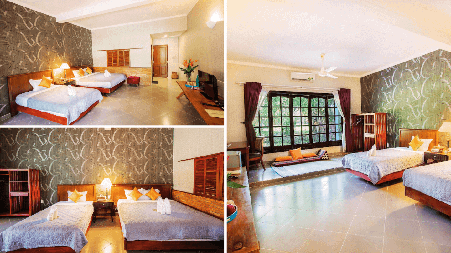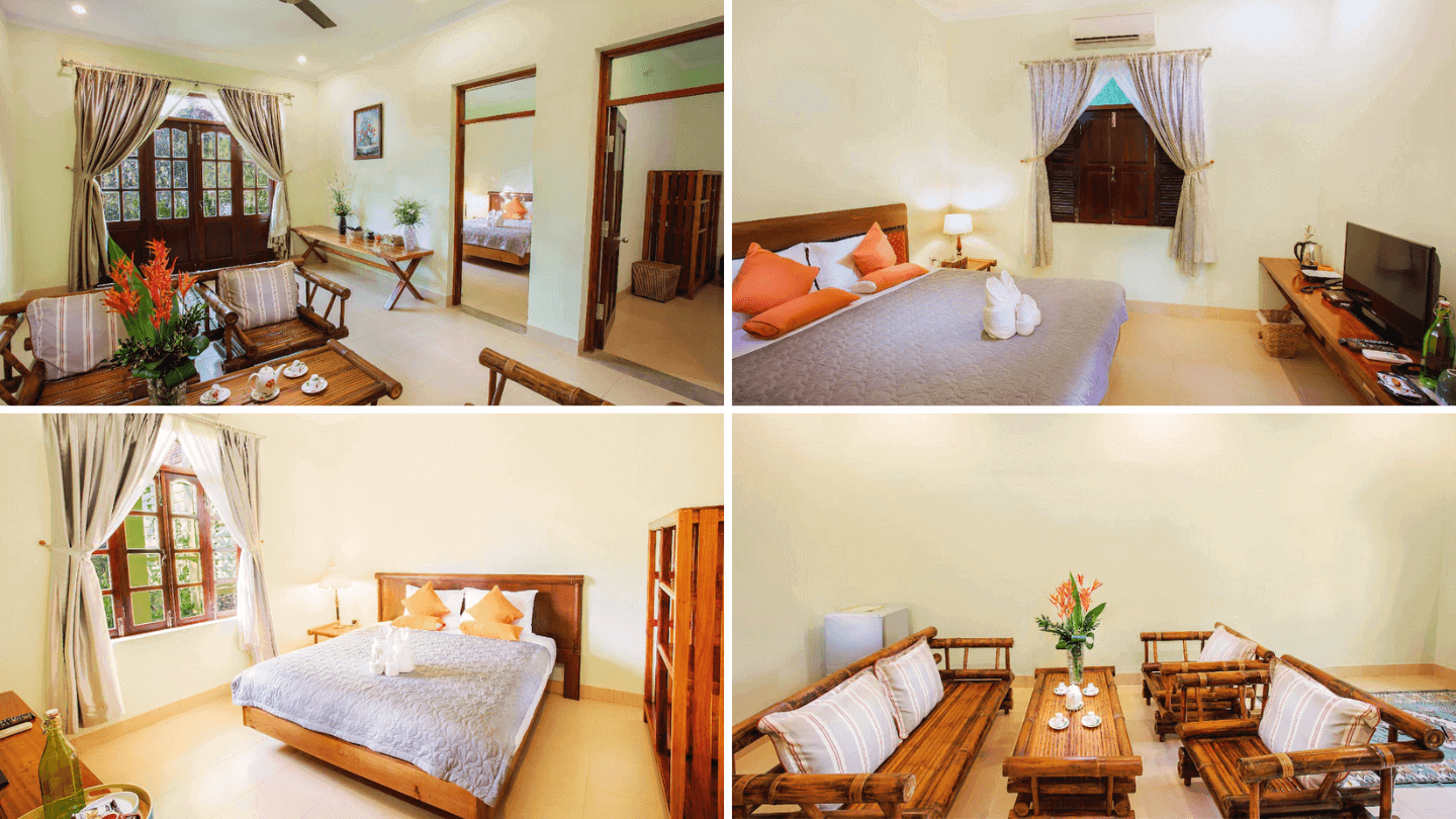 Phòng nghỉ này là lựa chọn lý tưởng cho nhóm bạn đông người hoặc đoàn khách du lịch. Với diện tích rộng khoảng 95m2,phòng được bố trí các giường đơn và đôi,phù hợp cho cả nam và nữ,cùng một phòng khách rộng rãi làm không gian sinh hoạt chung. Toàn bộ không gian mở ra tầm nhìn thoáng đãng,hướng vườn,mang lại cảm giác dễ chịu và thư thái cho du khách.