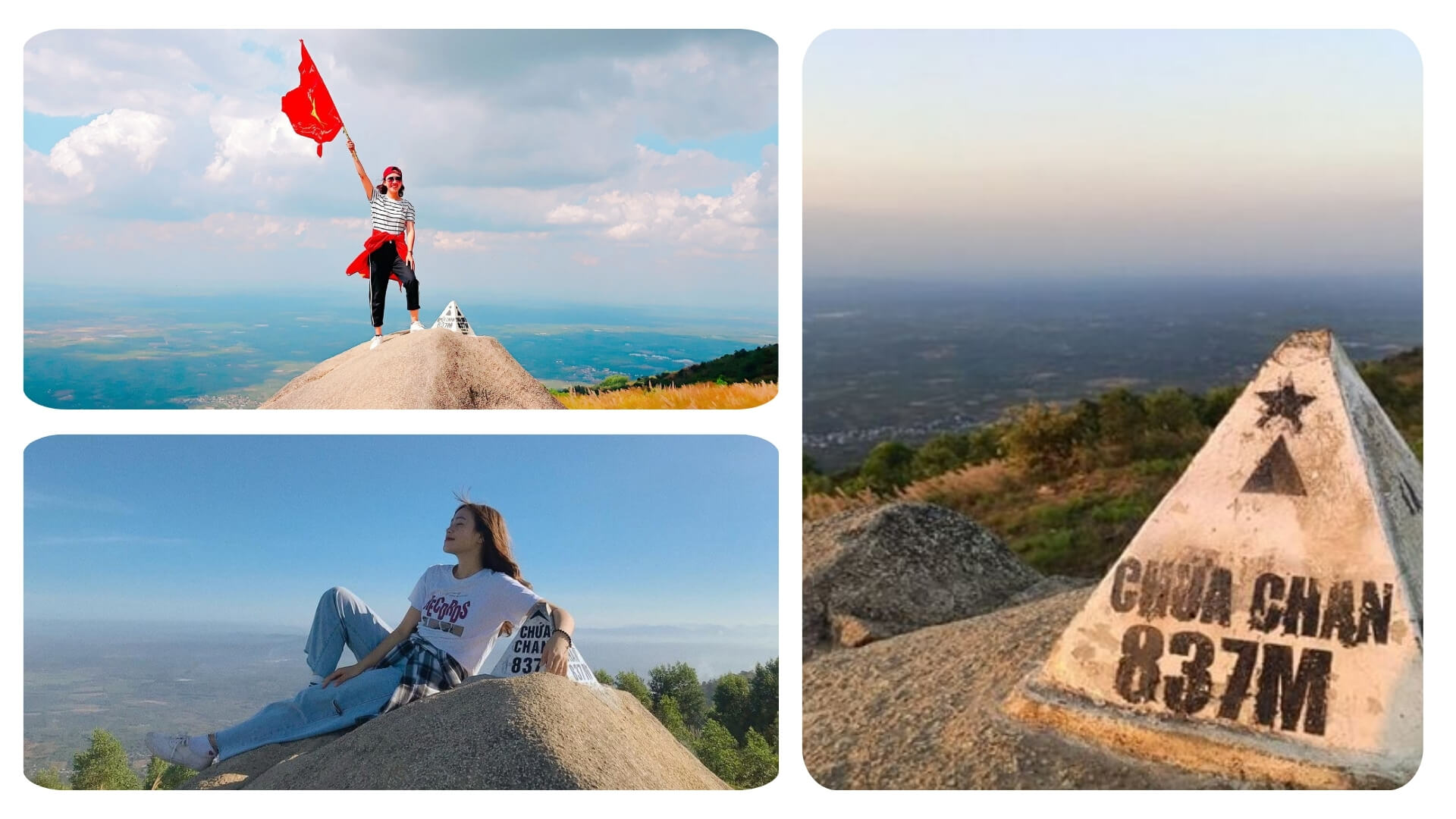 Một trong những điểm check-in được yêu thích nhất tại núi Chứa Chan chính là đỉnh núi với cột mốc 837m. Tại đây,bạn có thể dễ dàng leo lên mỏm đá cao để phóng tầm mắt xuống khung cảnh hoang sơ của những dãy rừng và thành phố phía xa. Trước mặt là những đám mây trắng lững lờ trôi,tạo nên một bức tranh thiên nhiên đầy thi vị.