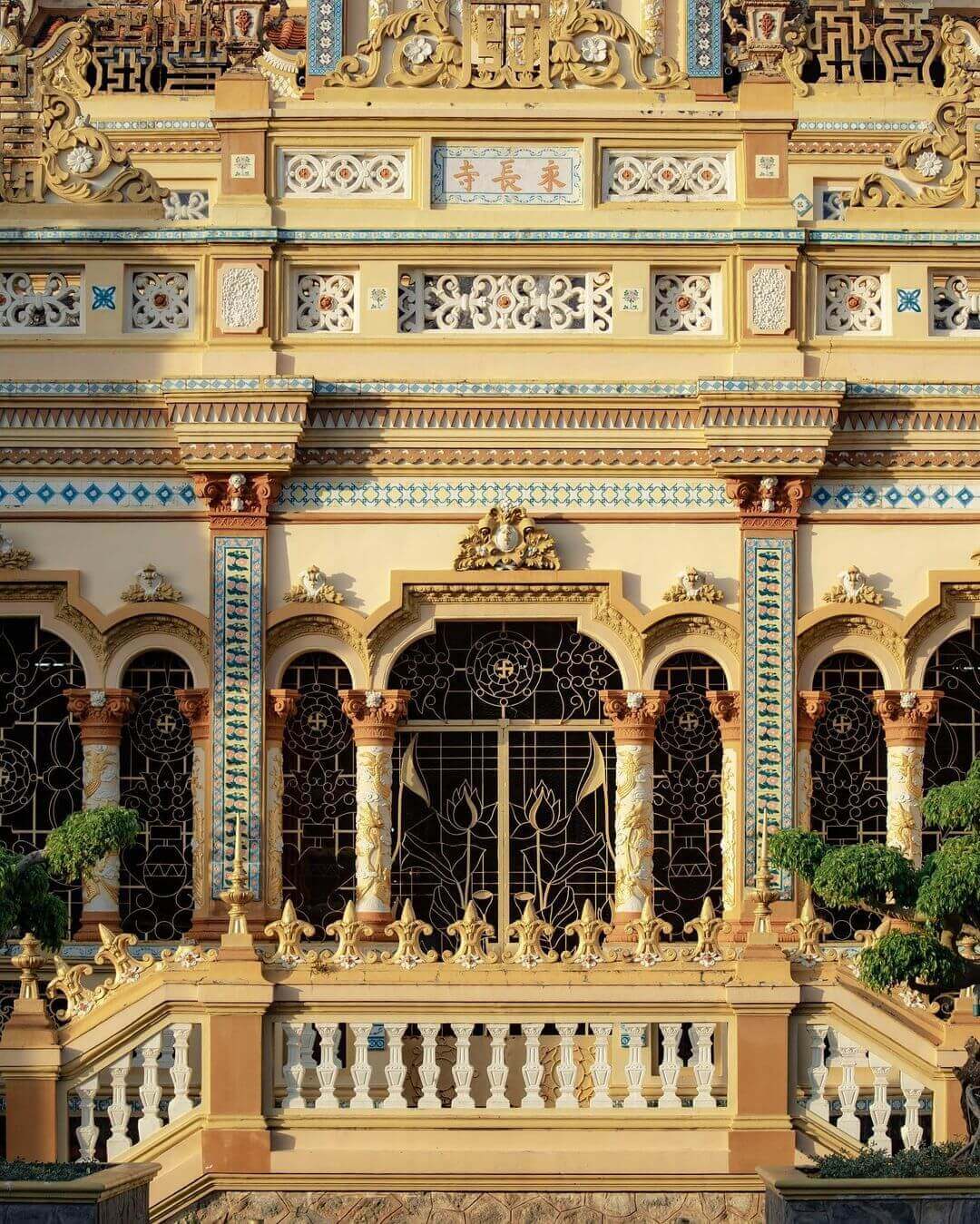 Initially,Vinh Trang Pagoda was built in the architectural style of the North,in the shape of the Chinese character “Quoc”. Later,additional architectural features from the Khmer and Western cultures were incorporated. However,the main design of Vinh Trang Pagoda remains faithful to Vietnamese tradition. The pagoda consists of four main sections: the front hall,the main hall,the ancestral hall,and the back hall. The pagoda covers an area of 14,000 square meters and is constructed with cement and various precious woods.