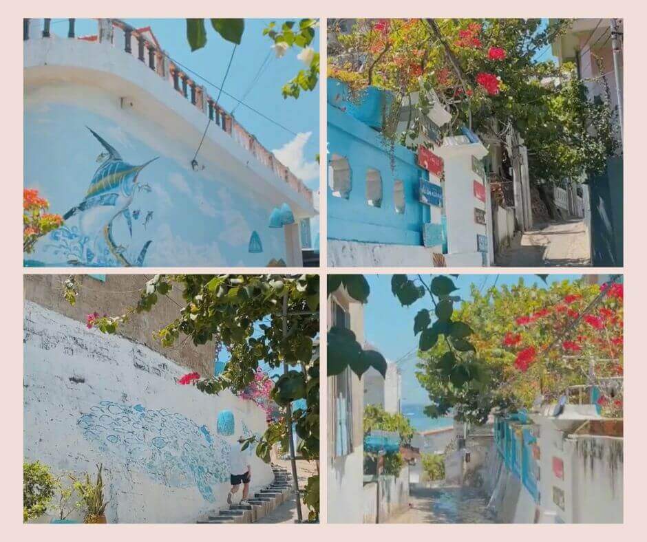 Đến với làng chài,bạn nhất định phải check in với các góc như: Đứng trước một ngôi nhà bất kì,đi bộ dọc trên các bật thang tức con góc nhỏ xuống biển,tường có vẽ hình con cá được họa sĩ vẽ rất tỉ mỉ và công phu,...
