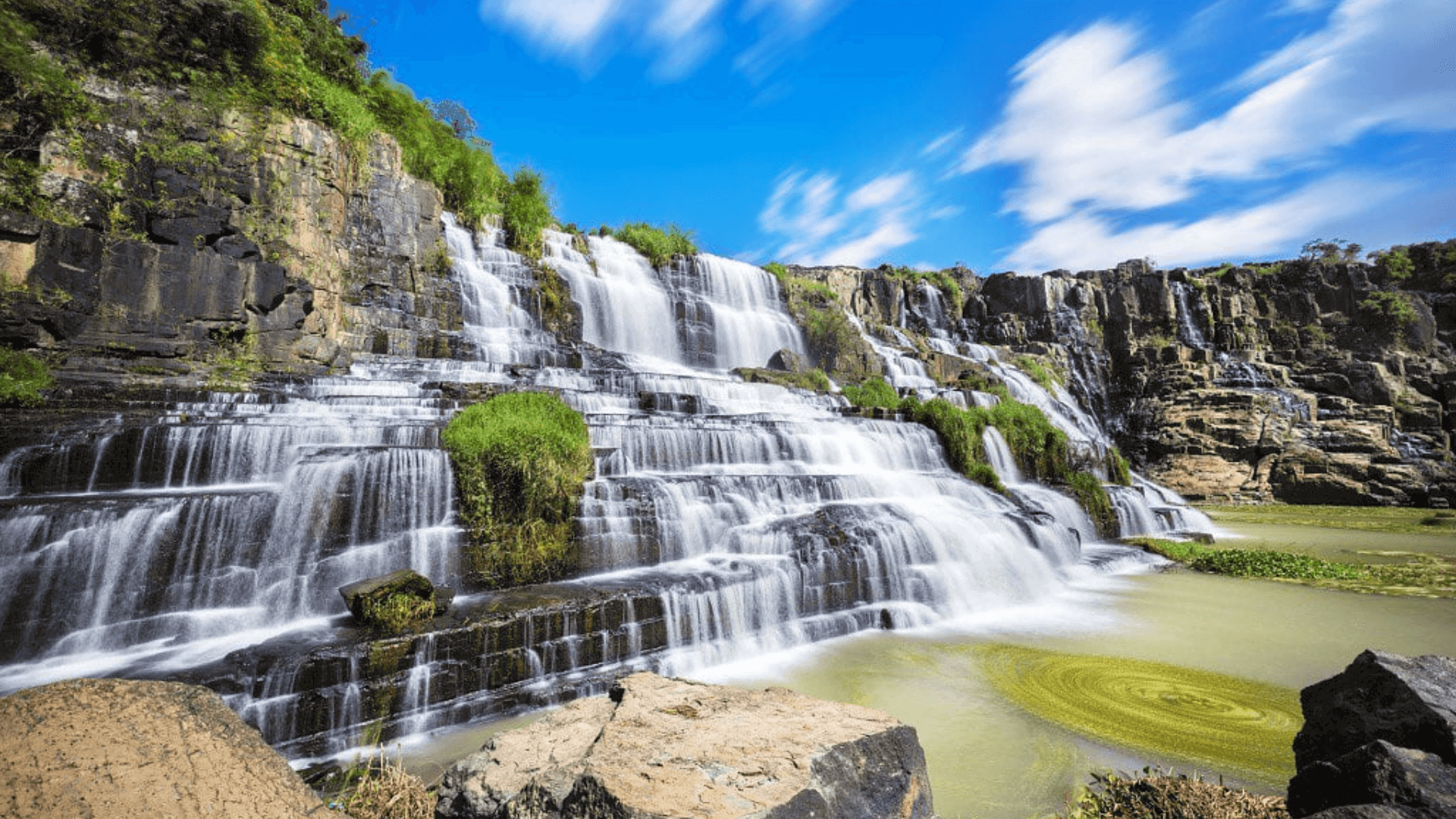 Pongour Waterfall is located on the flow of the Da Nhim River,which has created many beautiful waterfalls and lakes in Da Lat. The waterfall is about 40m high,more than 100m wide,gently flowing through 7 natural stone steps,creating white foam carpets; that's why people call it "Seven-Level Waterfall". Surrounding Pongour Waterfall is a primeval forest system of more than 2.5ha with diverse vegetation. The downstream area of the waterfall is a vast lake,with many rocks undulating in the middle of the water,suitable for camping,resting and sightseeing.