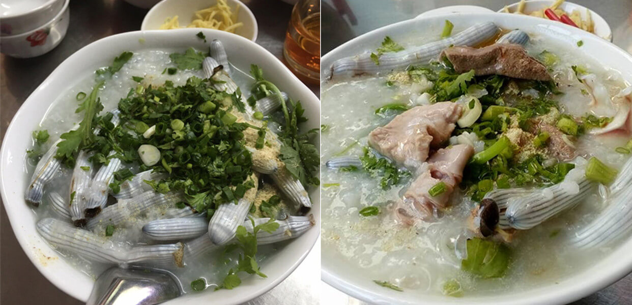Phần chất liệu chính làm nên sự khác biệt là sá sùng – loài trùng biển có giá trị dinh dưỡng cao. Người ta thường ví sá sùng là “ngọc biển” bởi hương vị đậm đà và khả năng bồi bổ sức khỏe. Món cháo này thường được nấu theo phong cách của cộng đồng người Tiều,giữ nguyên độ giòn sật đặc trưng của sá sùng. Khi thưởng thức,bạn sẽ cảm nhận thấy từng miếng sá sùng mềm mại,đượm vị biển hòa cùng cháo ấm.