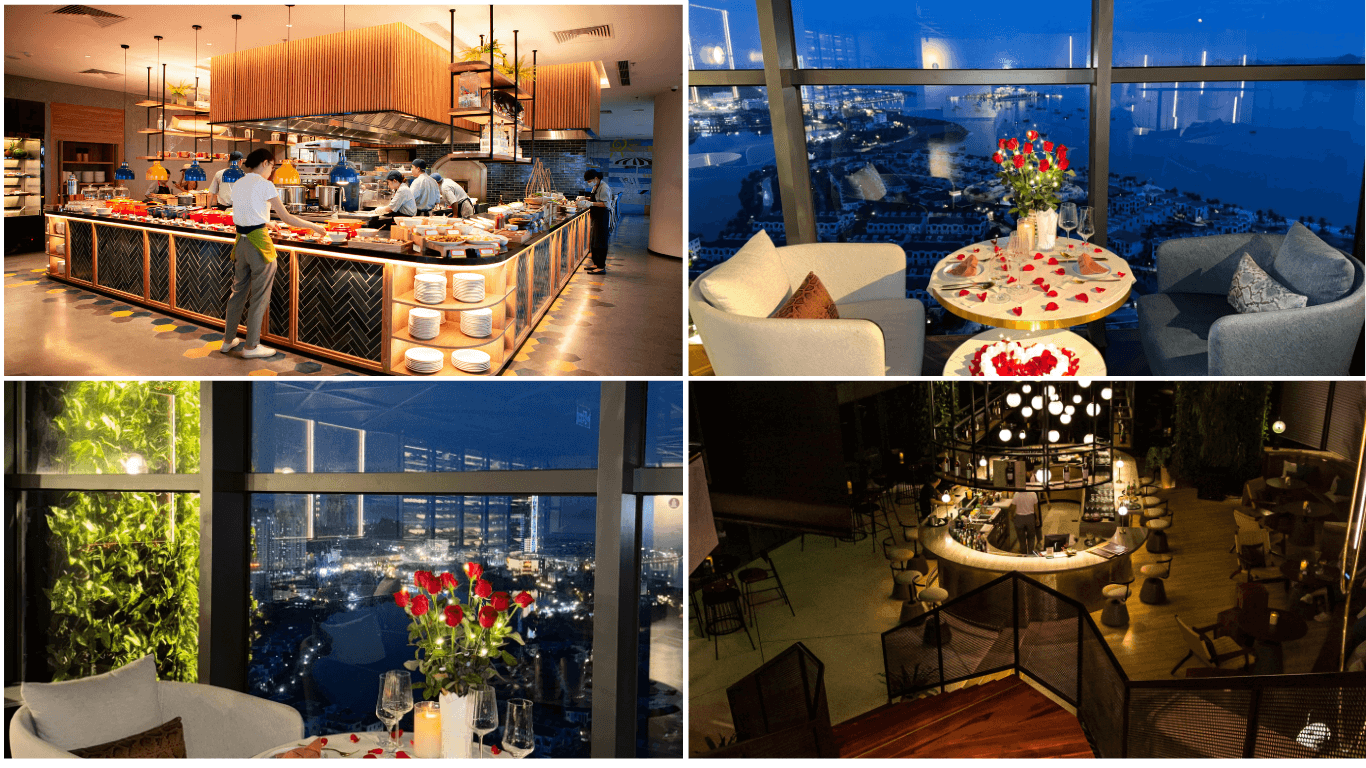 Từ Rooftop bar On The Rocks,du khách sẽ có cơ hội ngắm nhìn toàn cảnh vịnh Hạ Long từ một góc nhìn hoàn toàn khác biệt. Từ vị trí này,bạn có thể nhìn thấy những hòn đảo đá vôi nổi tiếng,những con thuyền du lịch dập dềnh trên mặt biển và khung cảnh của thành phố Hạ Long với những tòa nhà cao tầng và bến du thuyền sầm uất. Đây là một trải nghiệm tuyệt vời,giúp du khách cảm nhận vẻ đẹp hùng vĩ của thiên nhiên cùng với sự nhộn nhịp của thành phố.