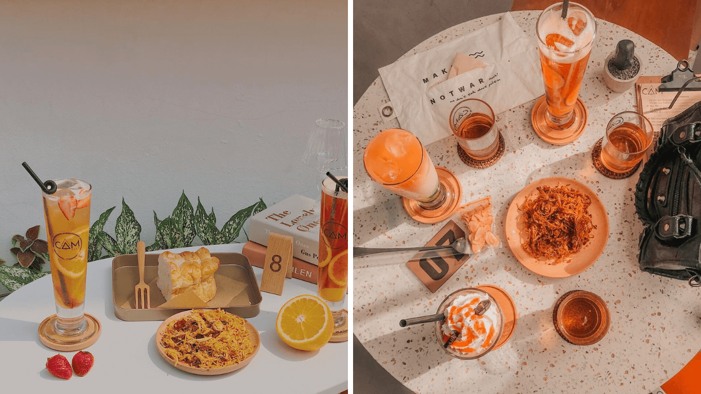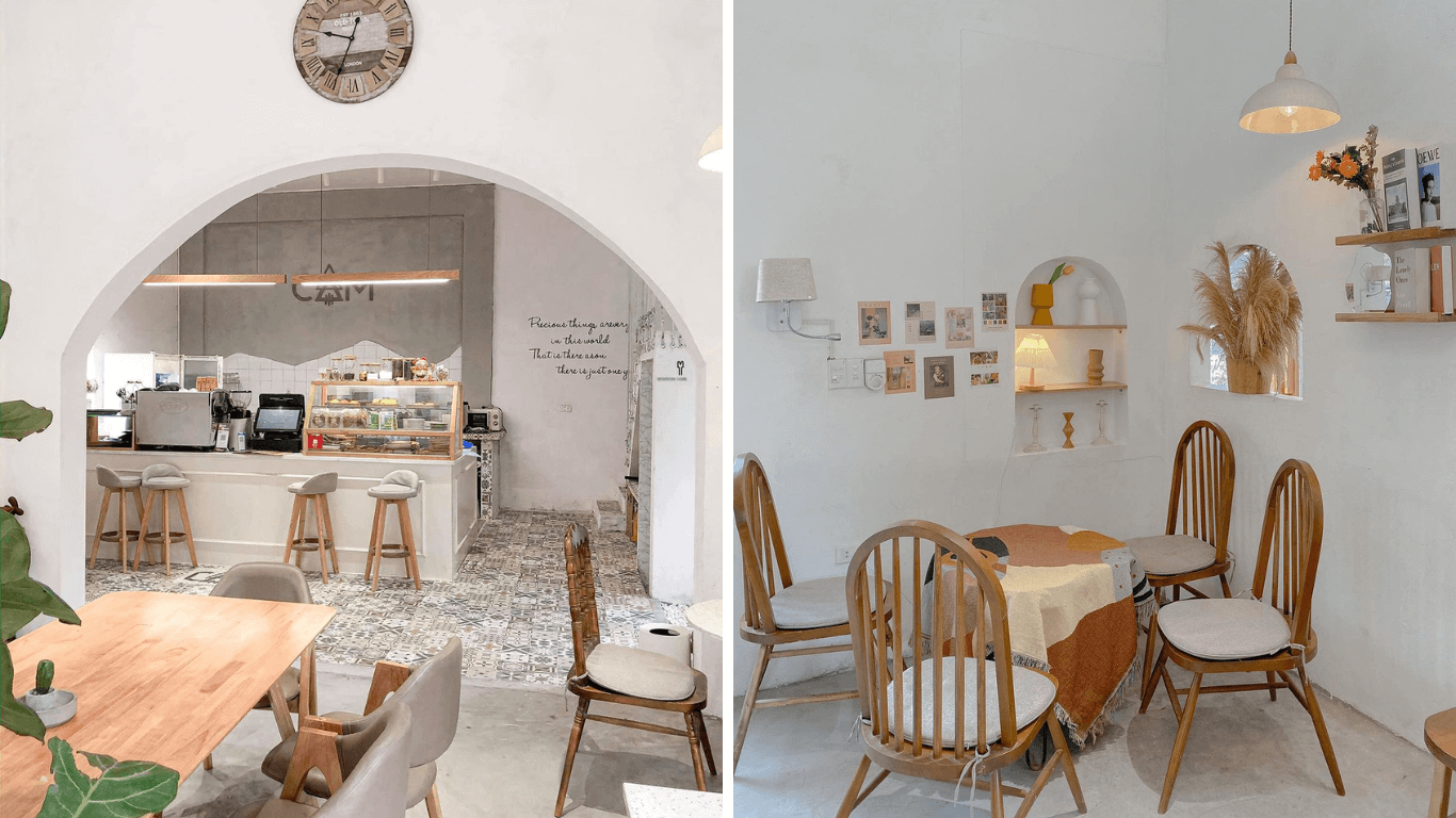 Cam Cafe được thiết kế theo phong cách tối giản,kết hợp tông màu trắng chủ đạo và nội thất gỗ ấm cúng. Ánh sáng tự nhiên từ cửa kính lớn chiếu vào mỗi buổi sáng,khiến quán thêm phần thoáng đãng. Tầng trệt tạo cảm giác gần gũi nhờ điểm xuyết cây xanh và một số món đồ trang trí xinh xắn. Tầng trên lại mang không khí yên tĩnh hơn,phù hợp cho khách muốn tập trung làm việc hoặc trao đổi nhẹ nhàng.