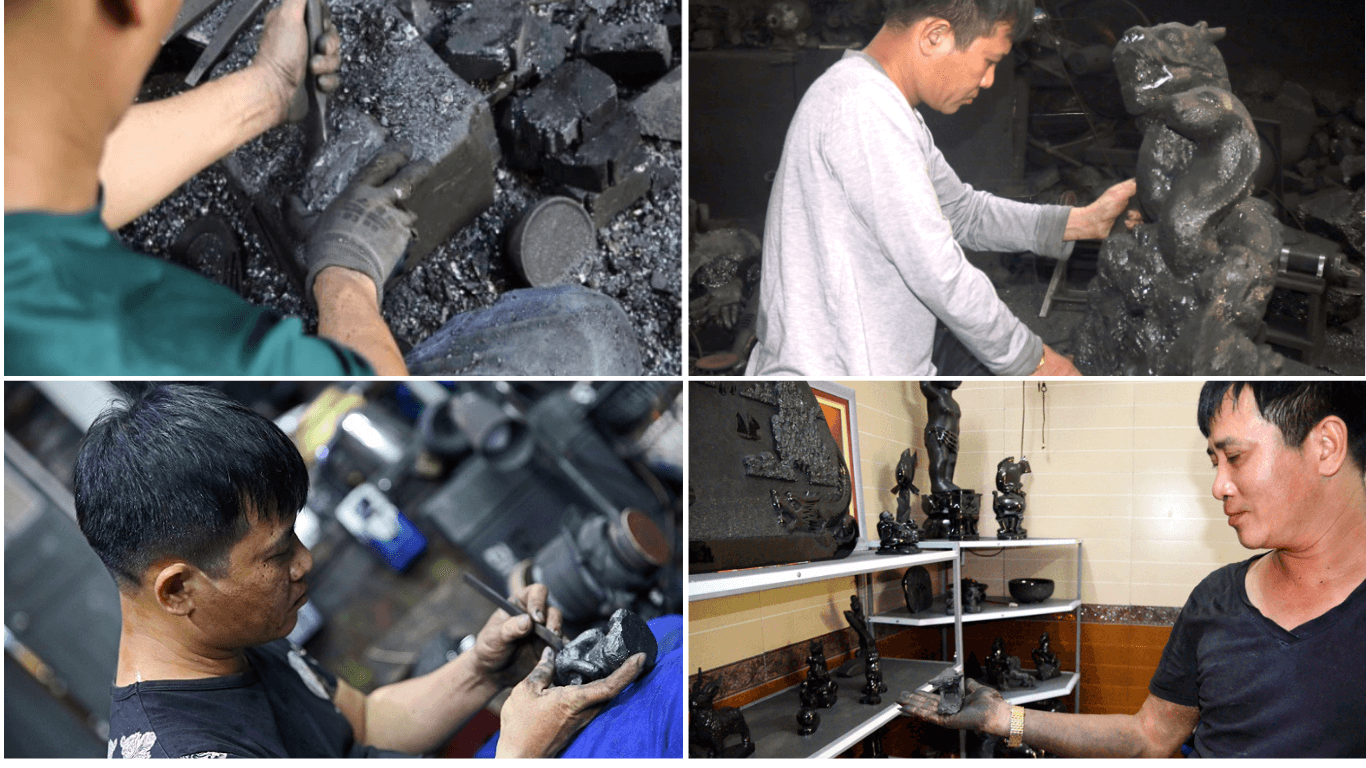 Những nghệ nhân chế tác than đá phần lớn xuất thân từ gia đình có truyền thống gắn bó với nghề mỏ,thấu hiểu đặc tính và giá trị của nguyên liệu. Họ chọn những khối than chắc,có độ đen sâu và dễ đục gọt,sau đó cẩn trọng khắc,tạc hình. Mỗi đường nét,góc cạnh đều được mài giũa công phu,phản ánh sự tỉ mỉ,cẩn trọng trong từng công đoạn. Thành quả là những tác phẩm nghệ thuật chứa đựng hơi thở vùng mỏ,lưu giữ câu chuyện lao động bền bỉ qua bao thế hệ.