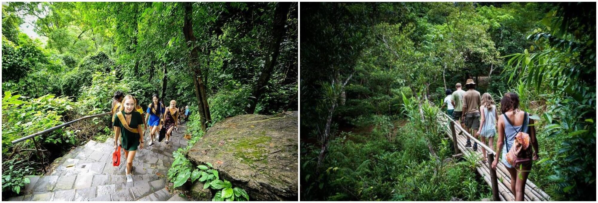 Đường đến Động Thiên Đường như mở ra một chương mới của sự tĩnh lặng. Cung đường uốn lượn giữa những rặng núi đá vôi sừng sững,cây cối hai bên xanh mướt tầng tầng lớp lớp. Tạm xa nhịp sống xô bồ,xe dừng lại ở bãi gửi. Từ đây,du khách bước những bước đầu tiên lên nền đất rừng nguyên sinh,bắt đầu chinh phục 500 bậc đá dẫn lên lối vào hang. Dốc núi kéo dài như một thử thách nhẹ làm tăng thêm giá trị của khoảnh khắc khi chạm đến cửa động.