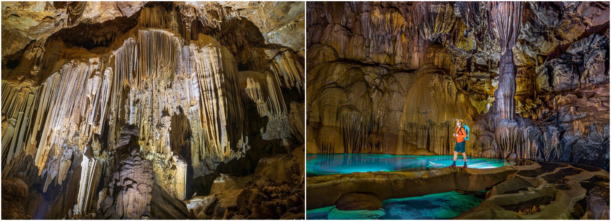 Sau khi băng qua ba ngọn núi đá vôi dựng đứng với địa hình hiểm trở phủ kín đá tai mèo sắc lẹm,Hang Hùng xuất hiện khiến tất cả phải lặng người ngay khi bước vào. Mỗi bước đi là một cuộc vật lộn với địa hình hoang dại,nhưng chính những thử thách ấy càng làm cho khoảnh khắc chạm đến hang Hùng thêm phần xứng đáng. Đi sâu hơn,những hang động cũng lần lượt hiện ra như một chuỗi kỳ quan liên tiếp từ hang Tròn với hồ nước ngầm xanh thẳm kéo dài hơn một cây số,hang Thung âm u và kỳ bí,mỗi nơi một sắc thái,một linh hồn riêng biệt.