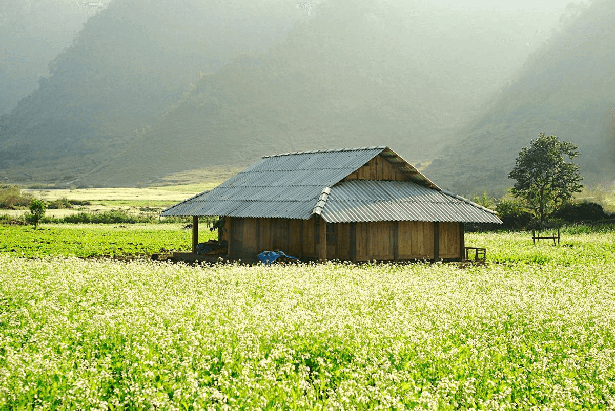 Những ngôi nhà ở bản Thung Cuông được ôm ấp giữa rừng hoa vùng cao bát ngát (Ảnh: Sưu tầm)