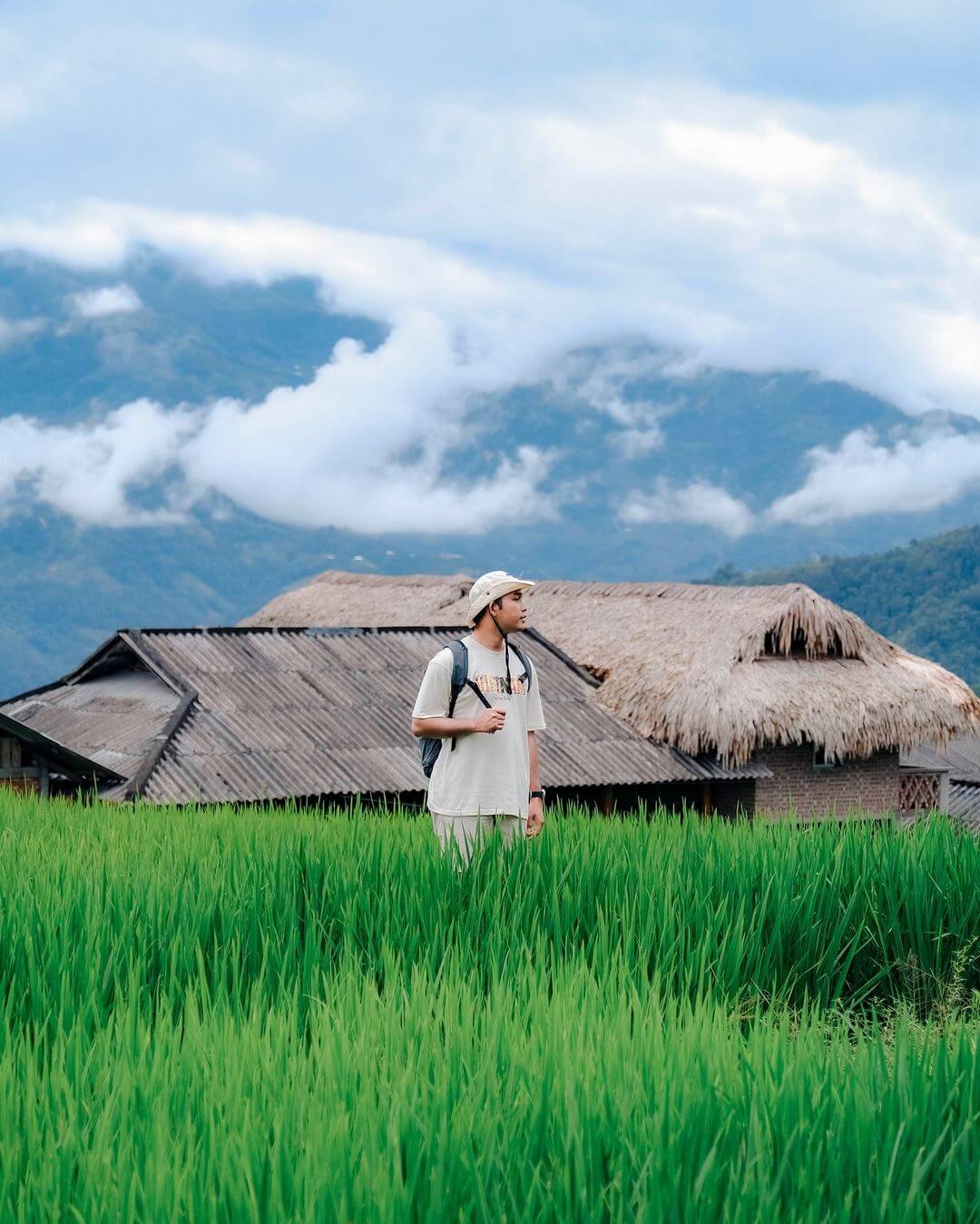 The most beautiful photo from my trip is the one below,capturing a perfect harmony. The rain had subsided from the night before. Early in the morning,the air was still heavy with moisture,and clouds began to gather lightly among the green mountains. Below were the vast golden rice fields. The fragrant scent of the rice filled the entire mountainous area. Small houses appeared faintly in the misty clouds,peaceful and serene.