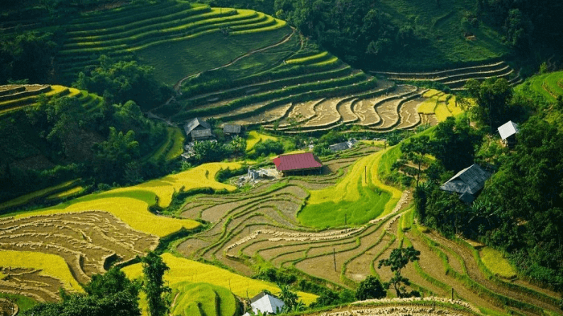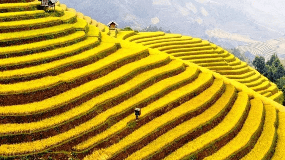 The best time to capture photos of the terraced fields during the ripe rice season in Hoang Su Phi is from mid-September to early October. During this period,the rice is ready for harvest,with the ears of rice drooping heavily and turning a golden yellow,layer upon layer of ripe rice extending across the landscape.