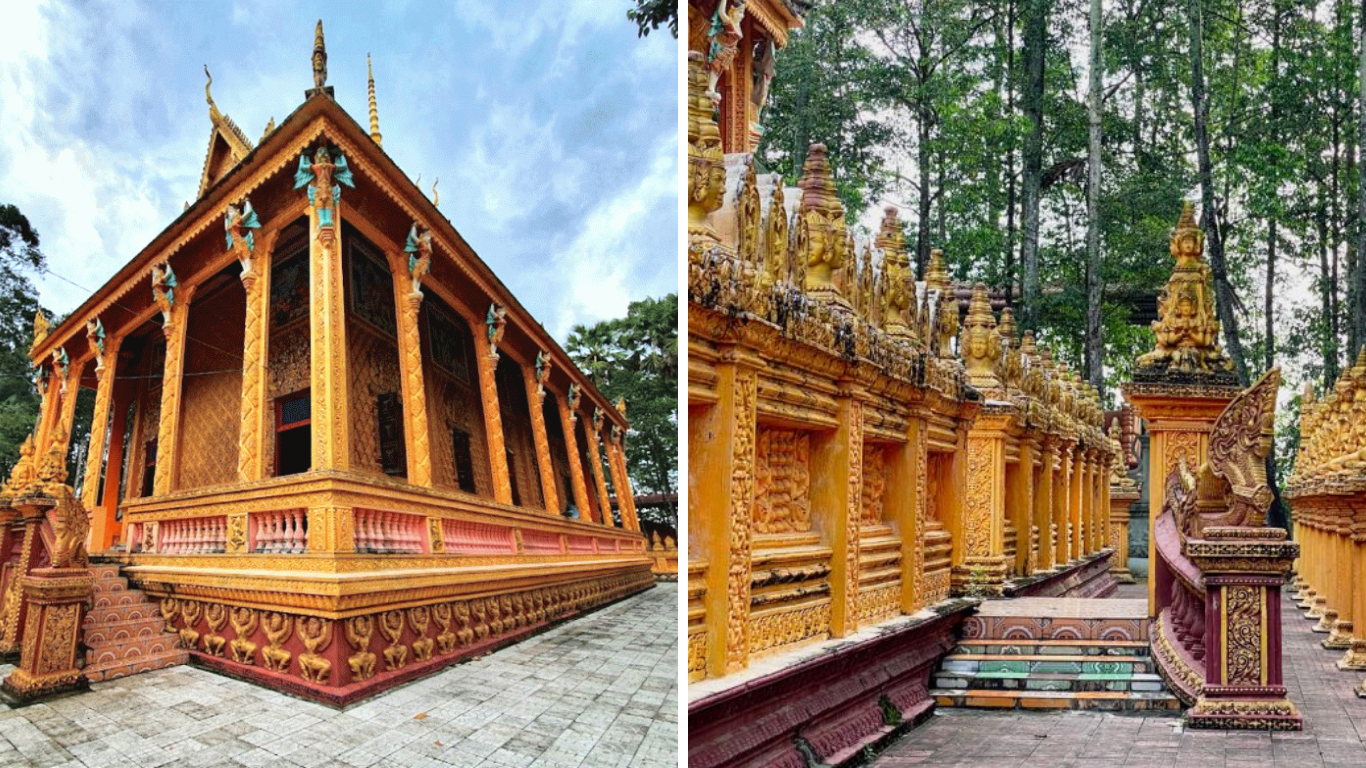 Ngay khi bước qua cổng chùa, màu vàng rực rỡ bao phủ toàn bộ các công trình sẽ thu hút ánh nhìn của bạn ngay lập tức. Lối kiến trúc tại đây là sự kết hợp hài hòa đầy tinh tế giữa văn hóa Ấn Độ, Thái Lan và Campuchia cực kỳ đặc sắc. Phần mái chùa được thiết kế xếp tầng lớp lên nhau với độ dốc cao vút tạo cảm giác thanh thoát nhẹ nhàng. Trên các đỉnh mái và đầu cột, hình tượng rắn thần Naga nhiều đầu được chạm trổ uốn lượn vô cùng mềm mại và sống động.