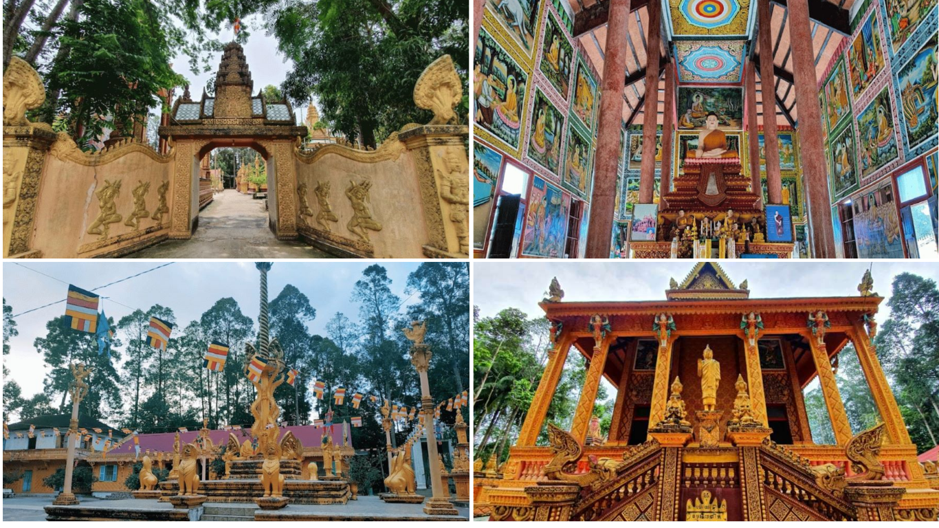 Không khí bên trong chùa lúc nào cũng mát mẻ dễ chịu nhờ vào những hàng cây sao và cây dầu cổ thụ to lớn. Những tán cây rộng lớn vươn dài tỏa bóng rợp mát cả một khoảng sân rộng giúp xua tan đi cái nắng nóng của miền Tây. Đặc biệt, sự xuất hiện của vài cây thốt nốt vươn cao giữa trời xanh càng tô điểm thêm cho vẻ đẹp đặc trưng của vùng đất này. Bạn hoàn toàn có thể tìm được những góc chụp ảnh cực đẹp hoặc đơn giản là ngồi nghỉ ngơi dưới gốc cây để tìm lại sự thư thái.