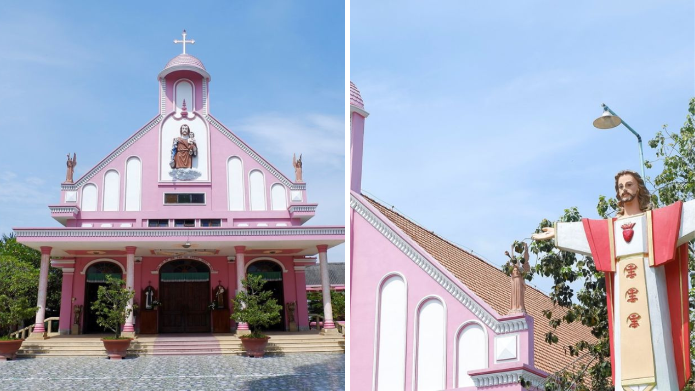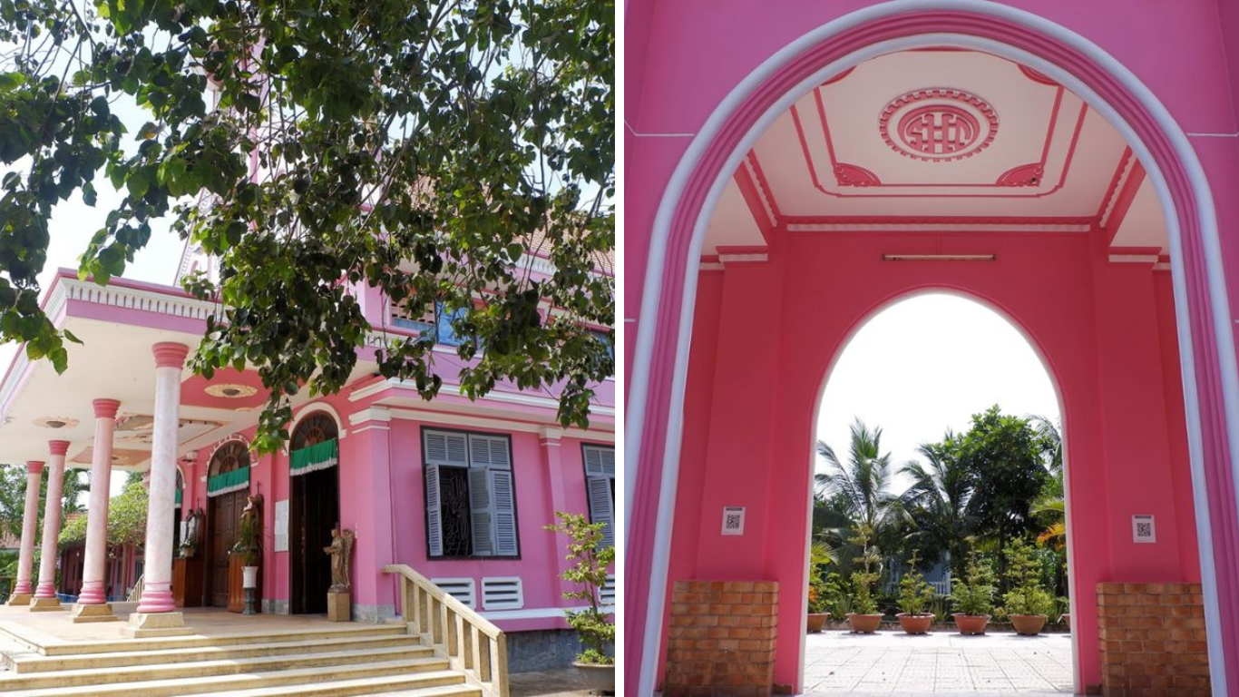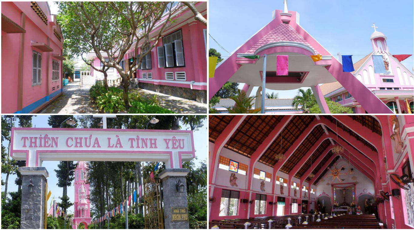 Điểm đặc trưng khiến Nhà Thờ Nhơn Phú trở nên nổi bật chính là gam màu hồng dịu dàng phủ khắp toàn bộ công trình. Màu sắc ấy hòa vào ánh nắng miền Tây,tạo nên khung cảnh vừa trang nghiêm vừa lãng mạn. Kiến trúc nhà thờ mang phong cách châu Âu cổ điển,với mái vòm cao,hàng cửa sổ cong đều nhau và tháp chuông thanh thoát vươn lên trời xanh. Từng chi tiết trang trí đều được chạm khắc tinh tế,thể hiện bàn tay khéo léo của những người thợ xưa.